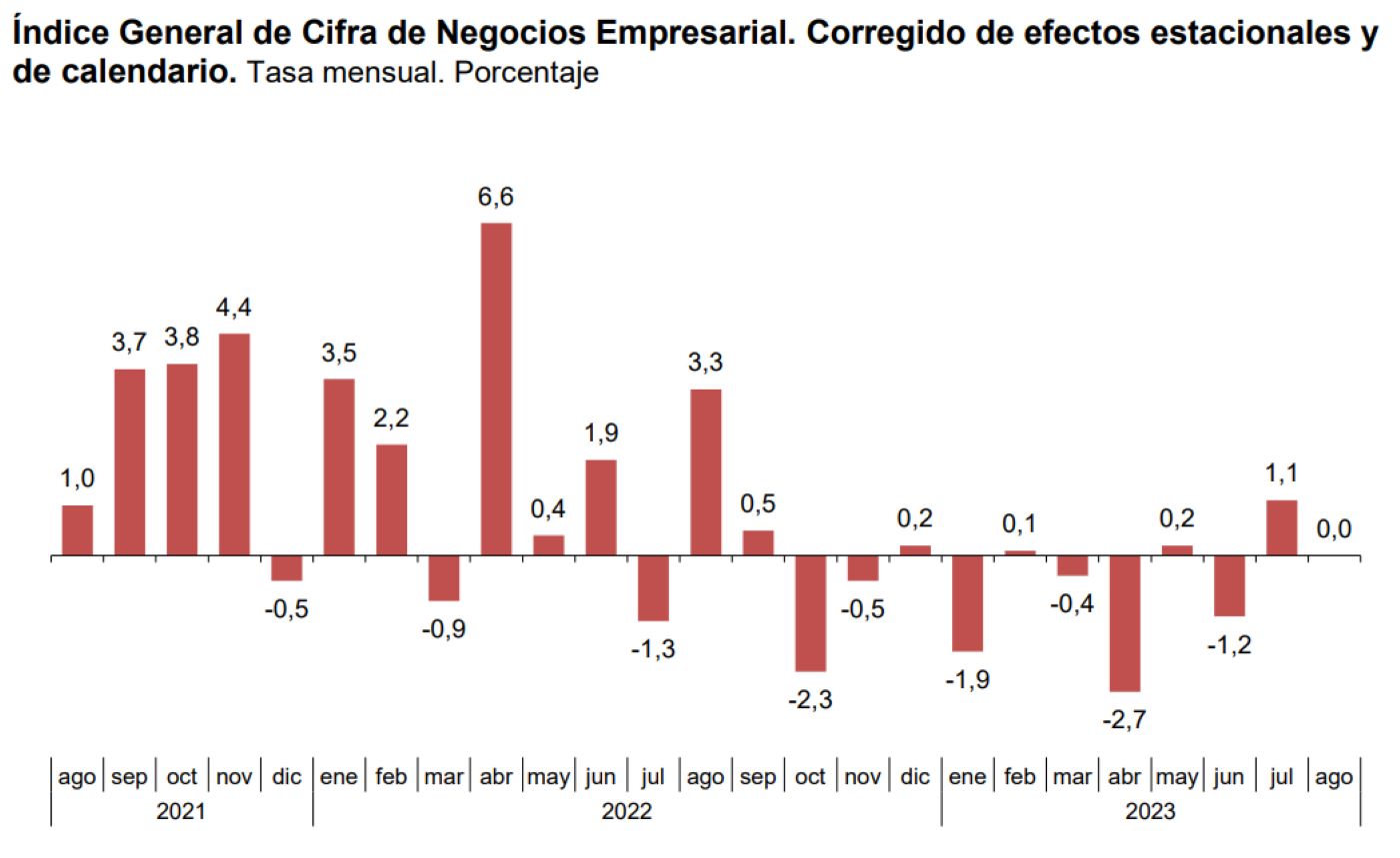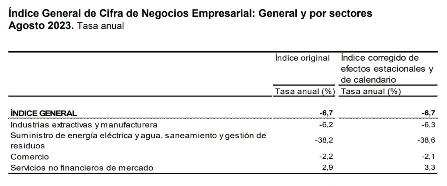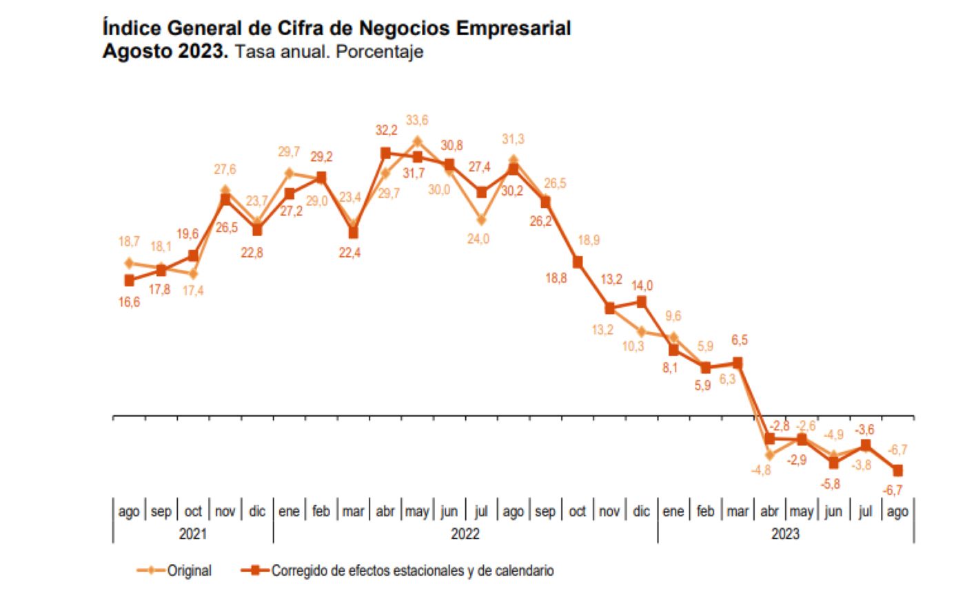 En este sentido, el INE acaba de publicar los datos de la Cifra de Negocios Empresarial, y lo que muestra es que en el mes de agosto bajó un 6,7% respecto del año anterior (tanto en la serie corregida de efectos estacionales y de calendario, como en la original), ampliando en casi tres puntos el retroceso interanual experimentado el mes anterior y encadenando cinco meses consecutivos de caídas interanuales. De hecho, este descenso de agosto es el más pronunciado desde febrero de 2021, cuando el retroceso del indicador fue del 9,2% (con la diferencia de que en ese momento nos encontrábamos inmersos en plena pandemia).