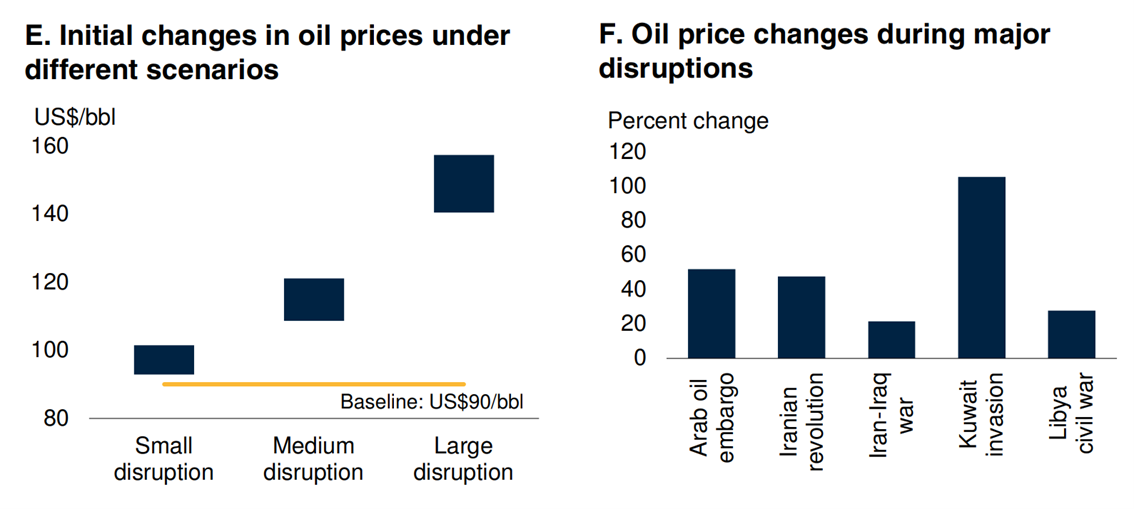 En un primer escenario de "escasa interrupción", el suministro mundial bajaría entre 500.000 y 2 millones de barriles diarios, similar a la reducción observada durante la guerra civil de Libia en 2011. En este caso, su precio subiría entre un 3% y un 13% con respecto al promedio del trimestre actual, oscilando así entre los 93 y los 102 dólares por barril.