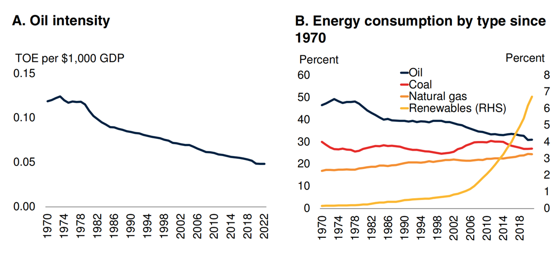 El informe explica que, hoy por hoy, la economía mundial puede absorber mejor el impacto que en los años 70 debido a que la cantidad de petróleo necesario para generar 1 dólar de PIB se ha reducido a más de la mitad.