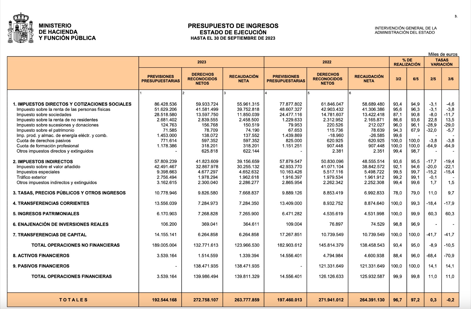 Los datos son demoledores. Tomando como referencia el cómputo de recaudación neta en el periodo entre enero y septiembre de 2023 y comparándolo con el mismo periodo de 2022, el desplome es ya sensible. En impuestos directos y cotizaciones, la caída es de un 4,6% -2.728 millones de euros menos-. Sólo en IRPF la pérdida de recaudación es de un 3,8% -1.553 millones de euros menos-.