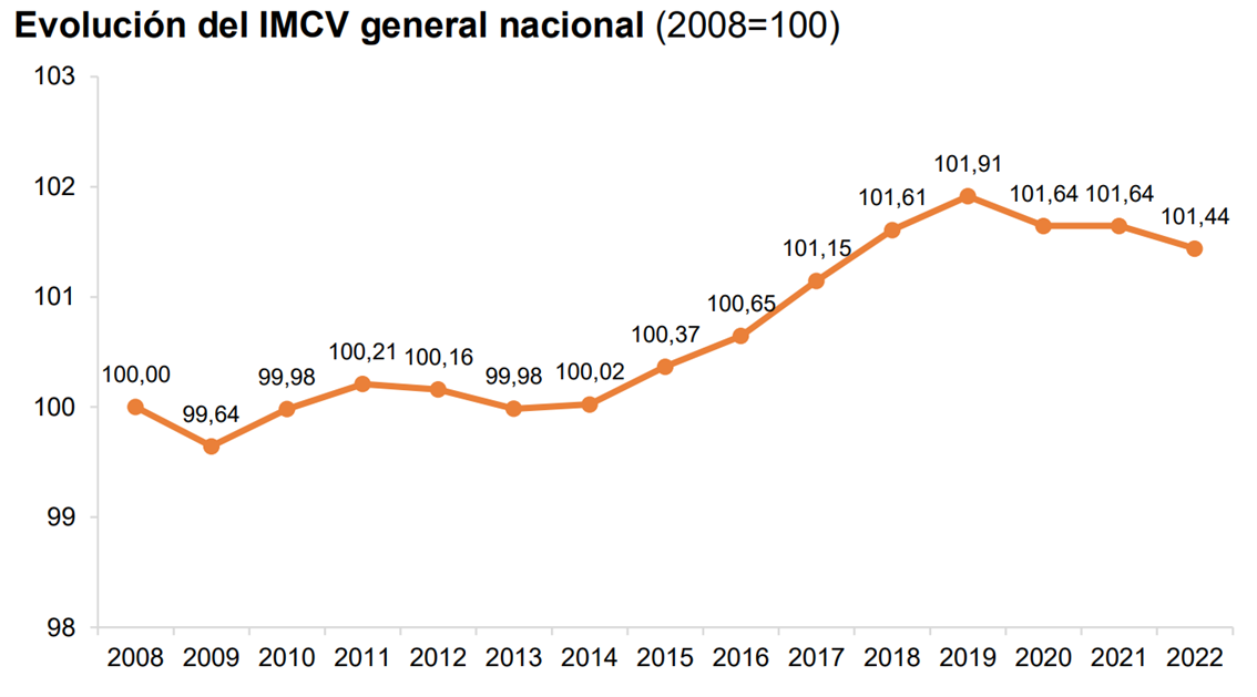 El IMCV se situó en 101,44 puntos en 2022, frente a los 101,64 del año anterior. Pero es que si se amplía la perspectiva temporal, se observa que la calidad de vida ha registrado un descenso aún mayor desde 2019, momento en el que arranca el actual mandato de Pedro Sánchez, cuando rozaba los 102 puntos.