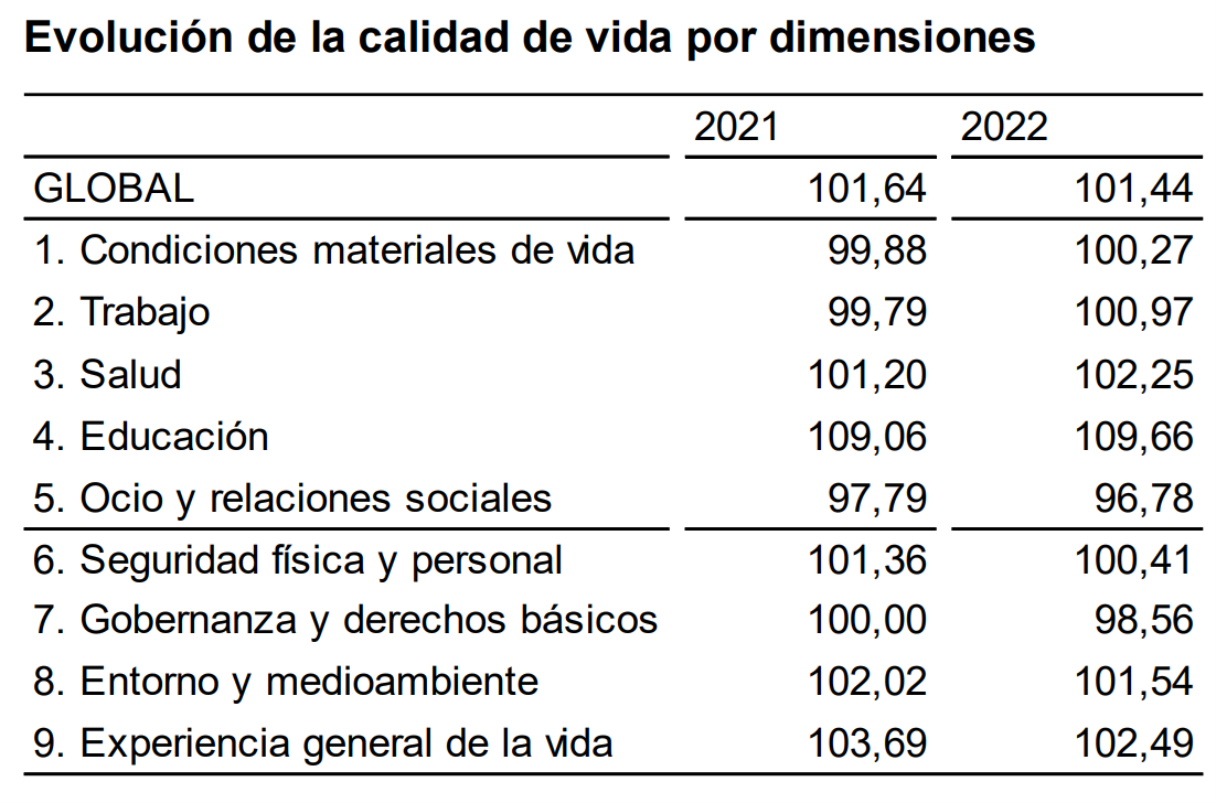 En el caso concreto del pasado año, la calidad de vida bajó por el retroceso registrado en Gobernanza y derechos básicos, Experiencia general de la vida, Ocio y relaciones sociales, Seguridad física y personal y Entorno y medioambiente. Por el contrario, las dimensiones de Trabajo, Salud, Educación y Condiciones materiales de vida mejoraron su puntuación respecto a 2021.