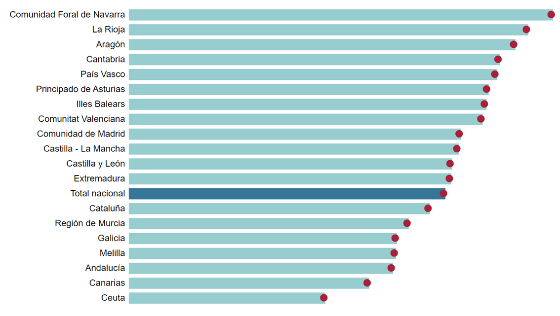 En cuanto al análisis territorial, Navarra, La Rioja y Aragón presentaron los niveles más elevados de calidad de vida en 2022, al igual que en la pasada edición. En el lado contrario, los registros más bajos se dieron en Canarias, Andalucía y Galicia.