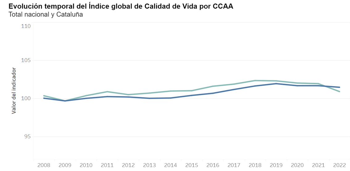 La segunda conclusión más relevante es el declive que experimenta Cataluña. Y es que, por primera vez desde que existen datos, el Índice Global de Calidad de Vida de los catalanes se sitúa por debajo de la media nacional.