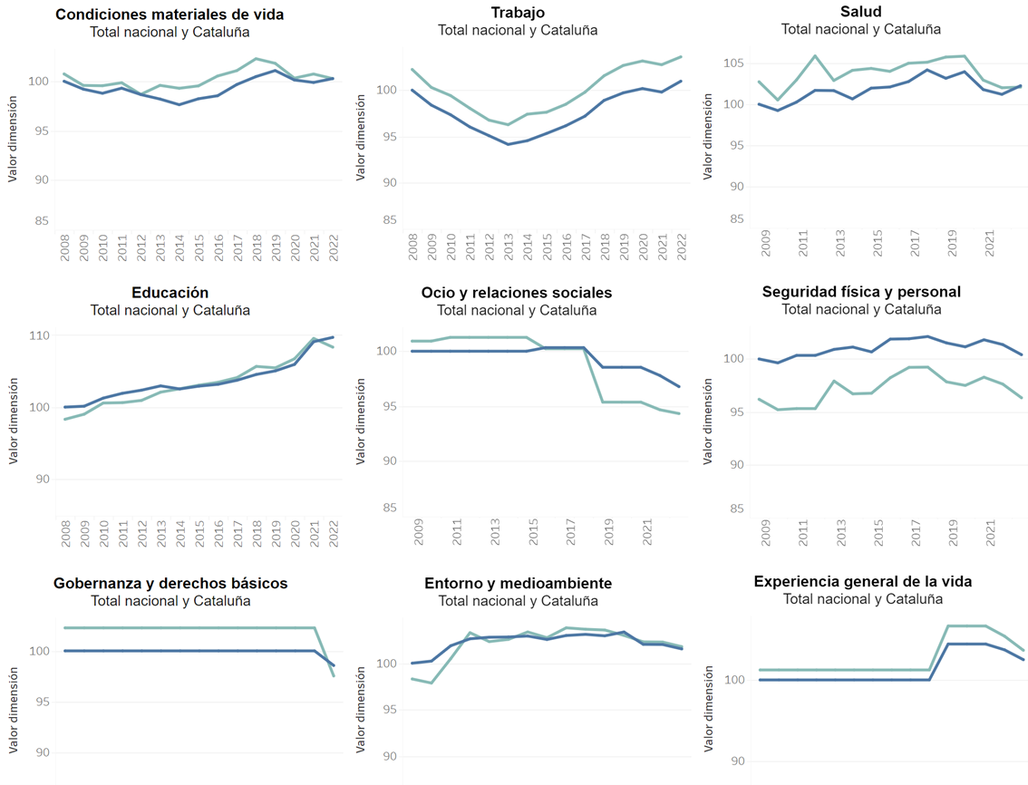 Destaca el descenso registrado en Condiciones materiales de vida, Salud, Educación, Ocio y relaciones sociales (especialmente tras el referéndum ilegal de 2017); Seguridad física y personal; y Gobernanza y derechos básicos.