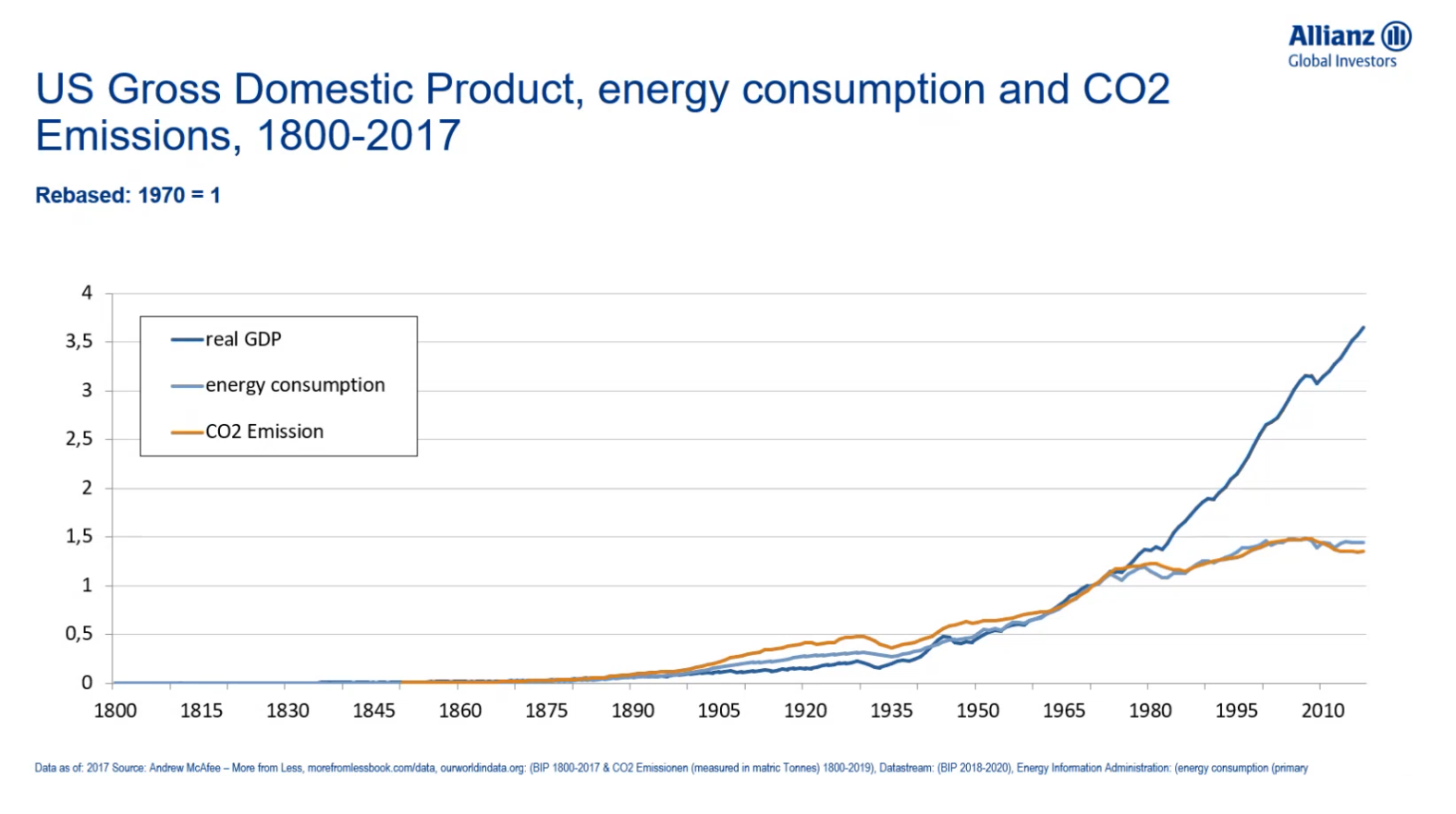 "El caso de Estados Unidos es especialmente relevante, porque hablamos de la primera economía del mundo. Si repasamos los últimos doscientos años podemos ver que sus niveles de PIB real han crecido mucho más que el consumo energético y las emisiones de CO2. Desde 1970, la economía estadounidense ha multiplicado su tamaño por 3,7 mientras que el consumo de energía o la producción de dióxido de carbono se ha multiplicado por 0,5", anotó el teutón.