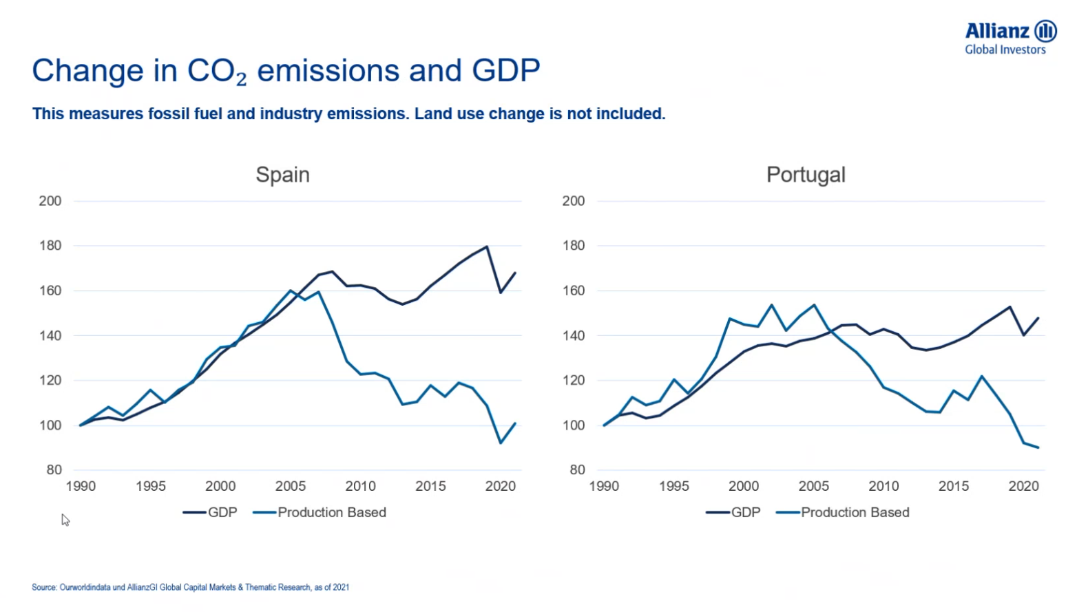 De igual manera, "en el caso de España y de Portugal, los datos muestran una historia similar. Desde 1990 hasta el presente, España ha visto cómo su economía crece aproximadamente un 70%, mientras que Portugal ha avanzado alrededor de un 50%. Pues bien, en ambos casos se aprecia un descenso de las emisiones de CO2. Para España, el desacople comienza en torno a 2005 y ha hecho que las emisiones observadas en la actualidad sean similares a las de 1990. Para Portugal, el calendario es muy similar y los resultados arrojan una caída incluso más pronunciada de las emisiones de CO2".