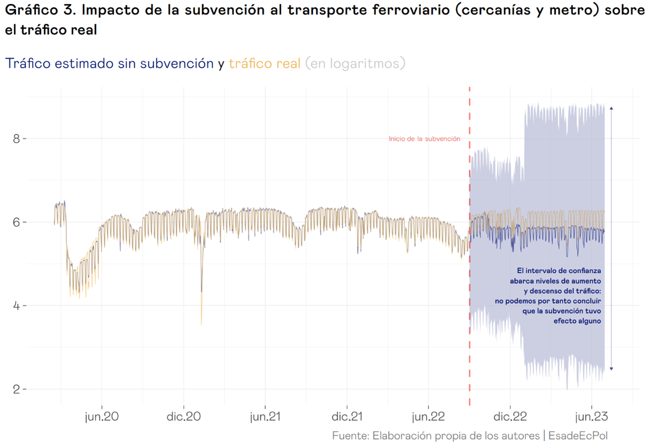 Un reciente estudio de EsadeEcPol concluye que este tipo de subvenciones generalizadas, donde ni siquiera se tiene en cuenta el nivel de renta para beneficiar exclusivamente a las familias más vulnerables, no sólo no logró reducir el tráfico urbano en Madrid, sino que tampoco tuvo efecto para las zonas con mayor intensidad de tráfico, menor (o mayor) nivel de renta, ni para las vías principales (M-30) de acceso a la ciudad, ni en las zonas con mejor acceso a tren de cercanías o metro.