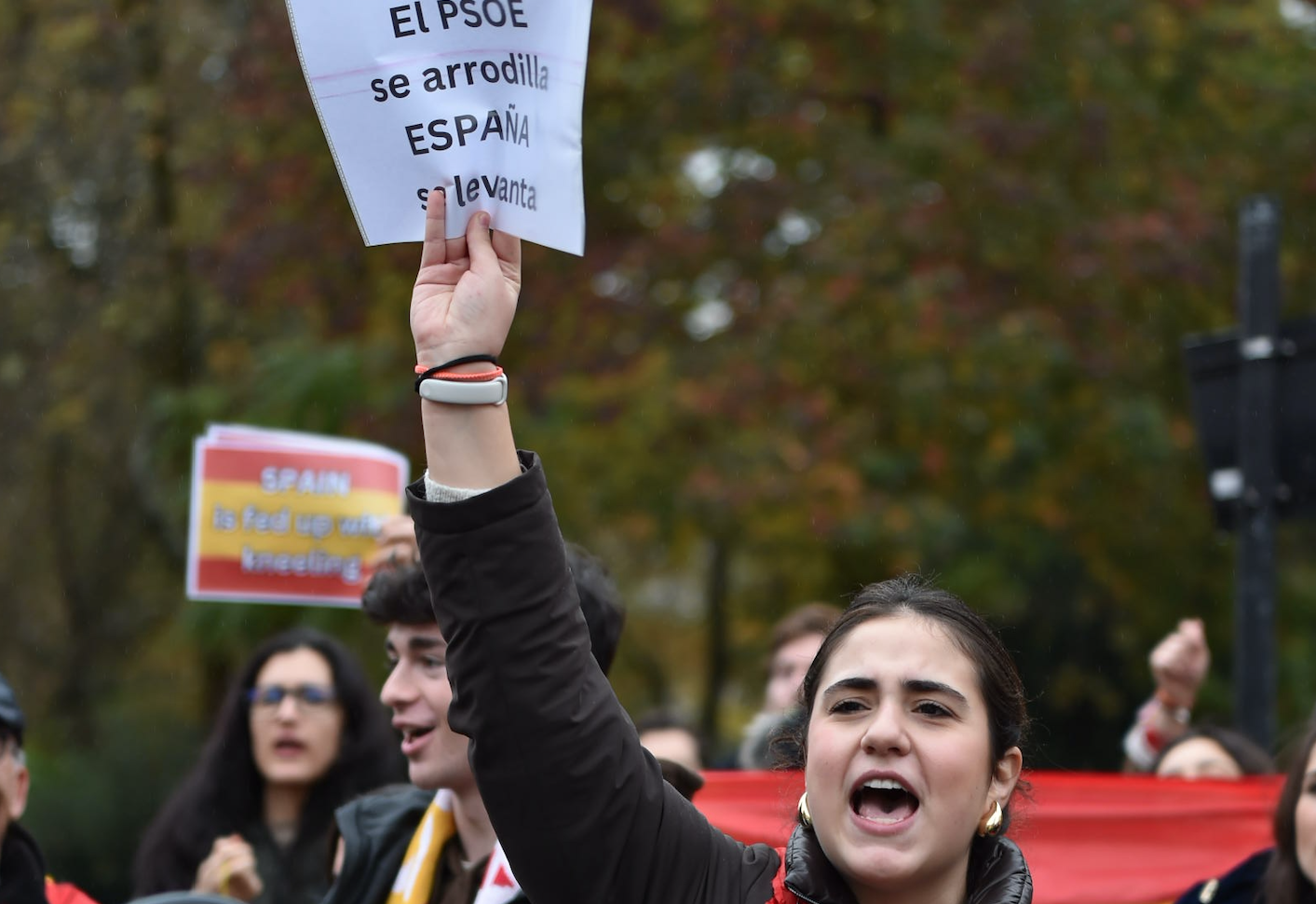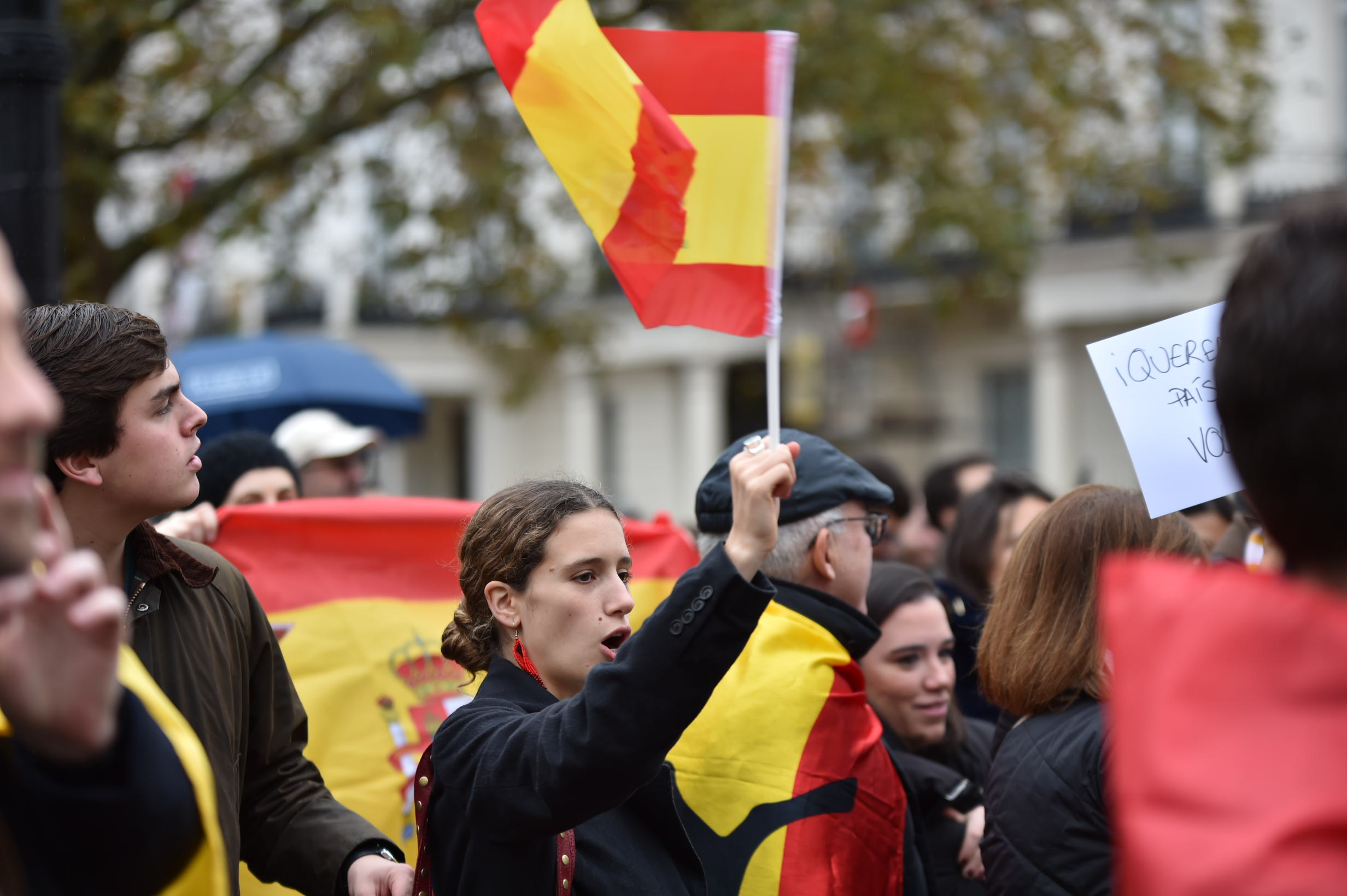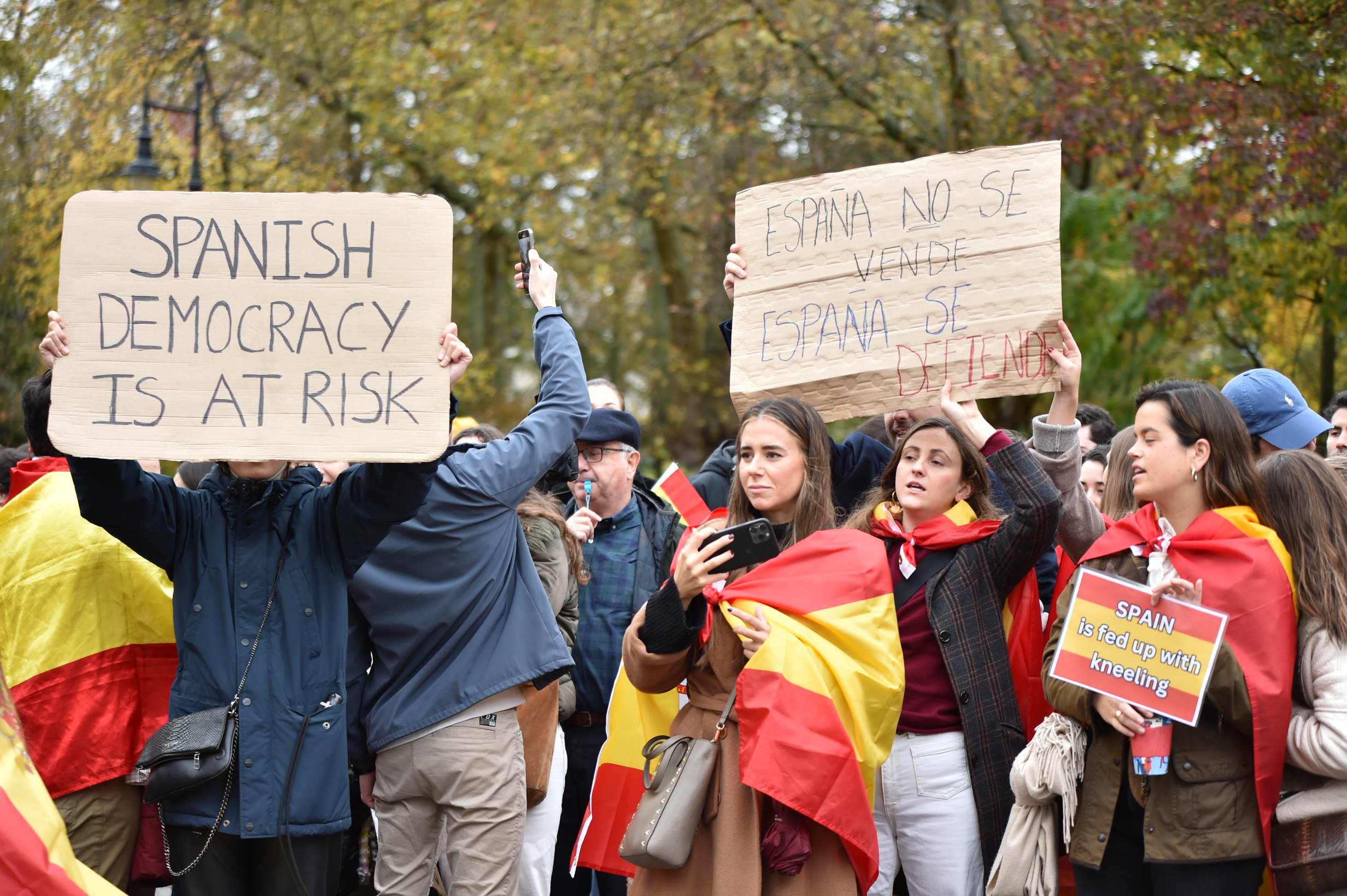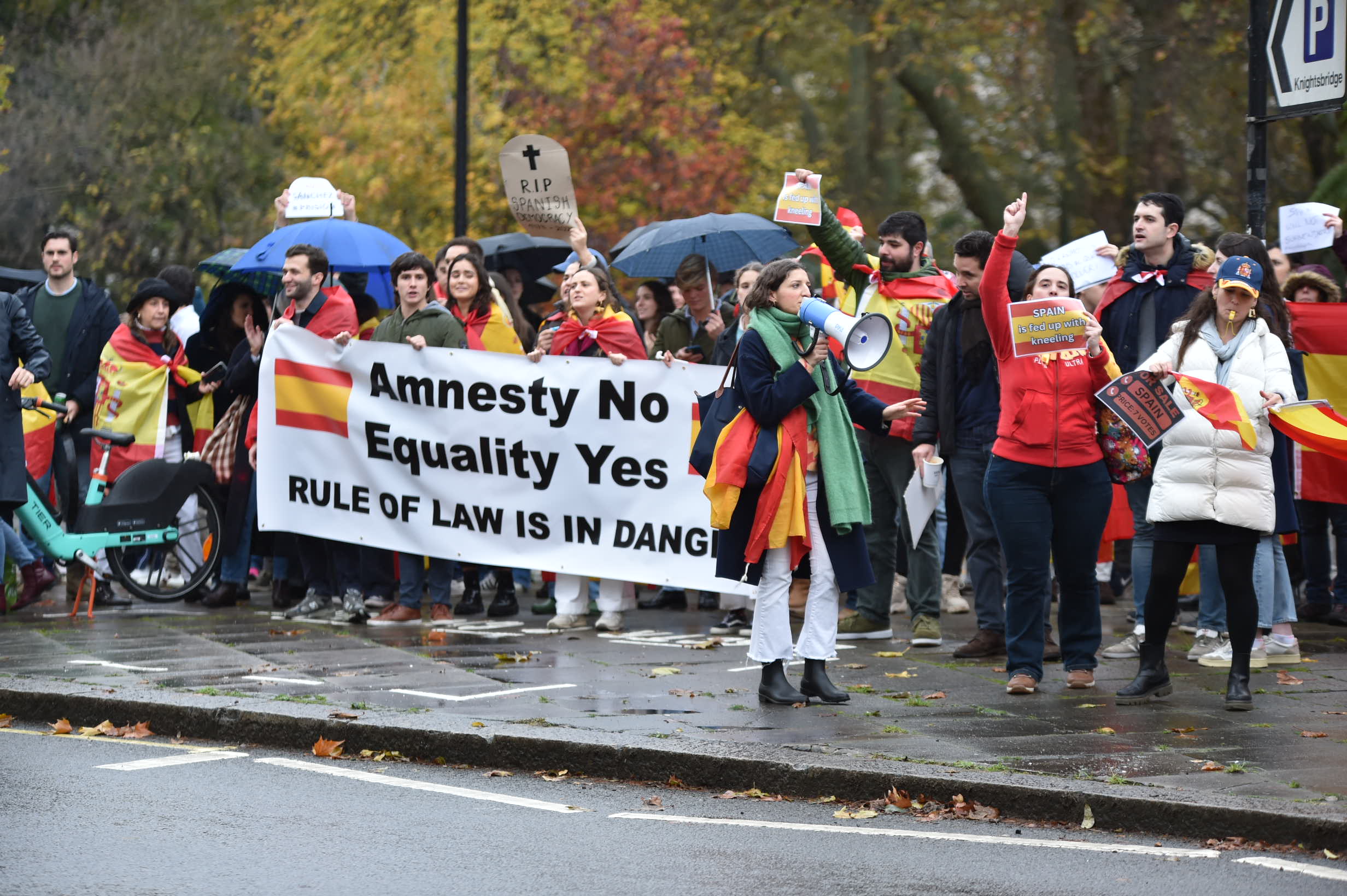 Medio millar de personas se dan cita en la capital inglesa para mostrar su rechazo a los pactos de Sánchez con el separatismo.
