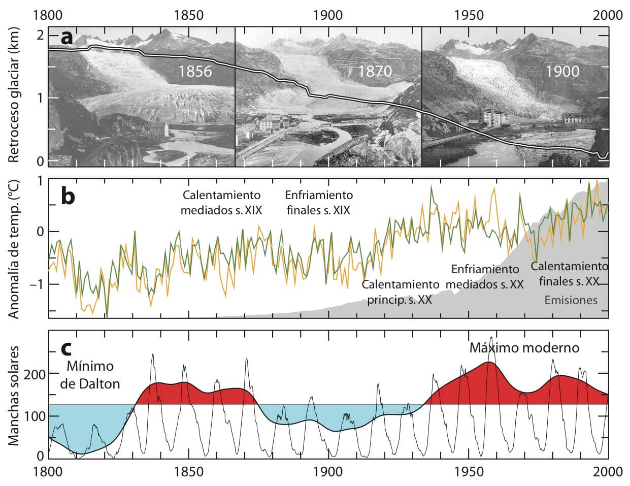 Según Vinós, el calentamiento de los últimos doscientos años tiene un fuerte componente natural, tal y como muestra el siguiente gráfico, donde se incluye el retroceso global de los glaciares y fotografías antiguas del glaciar del Ródano en Suiza; además, cambios en la temperatura deducidos de anillos de los árboles e indicadores climáticos muestran las fases del clima comparadas con el fuerte aumento de las emisiones de CO2 desde 1950; y la actividad solar, indicando el máximo moderno del siglo XX.