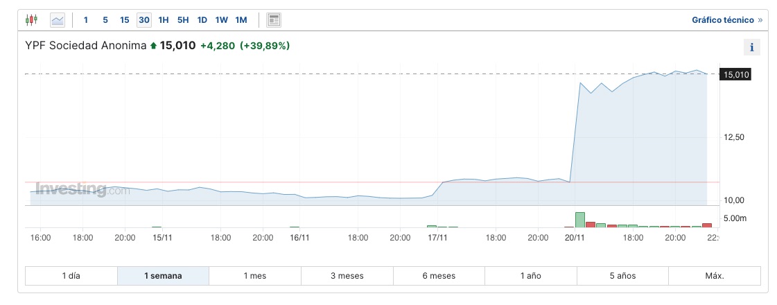 Y mientras políticos y periodistas de izquierdas de todo el mundo se llevan las manos a la cabeza por la victoria de Milei, la Bolsa brilla con los primeros anuncios. Este lunes, Javier Milei, ya como presidente electo, repitió que "todo lo que pueda estar en manos del sector privado va a estar en manos del sector privado", dijo, y así avanzó que mantiene su intención de privatizar YPF, la petrolera que el peronismo expropió a Repsol en 2012 y que, diez años después , vale un 75% menos. Argentina, además, ha sido condenada a pagar a 16.000 millones de dólares (14.630 millones de euros) al fondo Buford Capital y el estado apeló. YPF vale ahora mucho menos de lo que valía cuando fue expropiada .