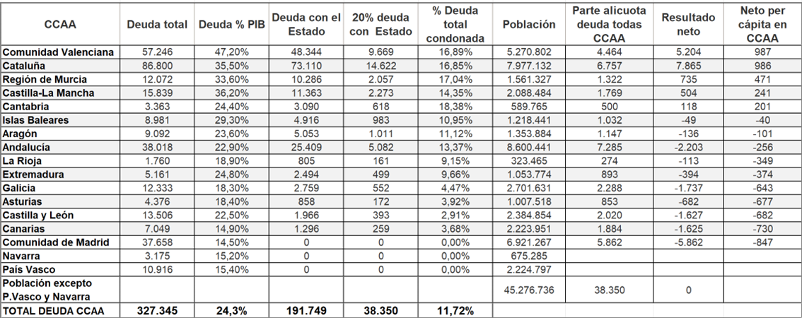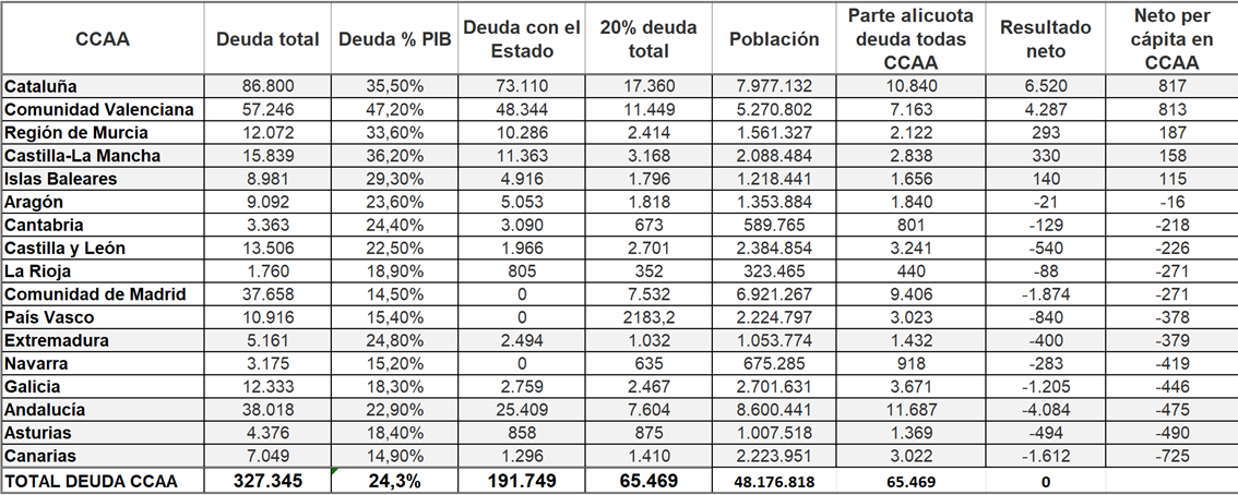 Aquí también habría vencedores y vencidos, puesto que las CCAA se han endeudado en mayor o menor intensidad. La ventaja de esta fórmula es que, al menos, se reduce la diferencia entre las que salen ganando y perdiendo, si bien el ranking de beneficiarios y damnificados varía. La deuda neta de catalanes y valencianos bajaría en unos 800 euros por habitante, mientras que los más perjudicados serían canarios, asturianos y andaluces.