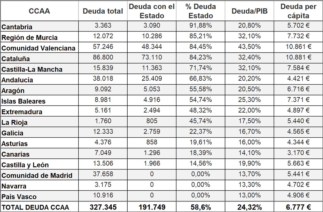 Las autonomías acumulan una deuda pública total de 327.000 millones de euros, una cifra equivalente al 24,3% del PIB nacional y unos 6.800 euros per cápita. Pero de esta cantidad casi 192.000 millones, más del 58% del total, son créditos procedentes del Estado (Gobierno Central).