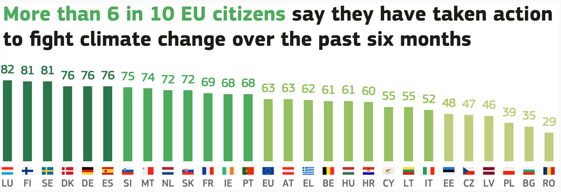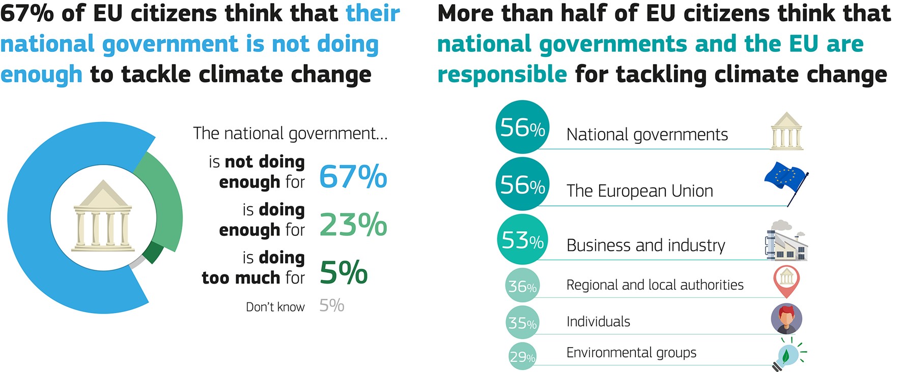 Según las últimas encuestas realizadas a nivel comunitario por el Eurobarómetro, el 77% de los europeos consideran el calentamiento global como un "problema muy grave". De hecho, es calificado como el problema más grave que enfrenta el mundo en algunos países de la UE (Bélgica, Dinamarca, Alemania, Irlanda, Malta, Países Bajos, Austria , Finlandia y Suecia), y se sitúa entre los tres primeros puestos en 16 de los 27 estados miembros.