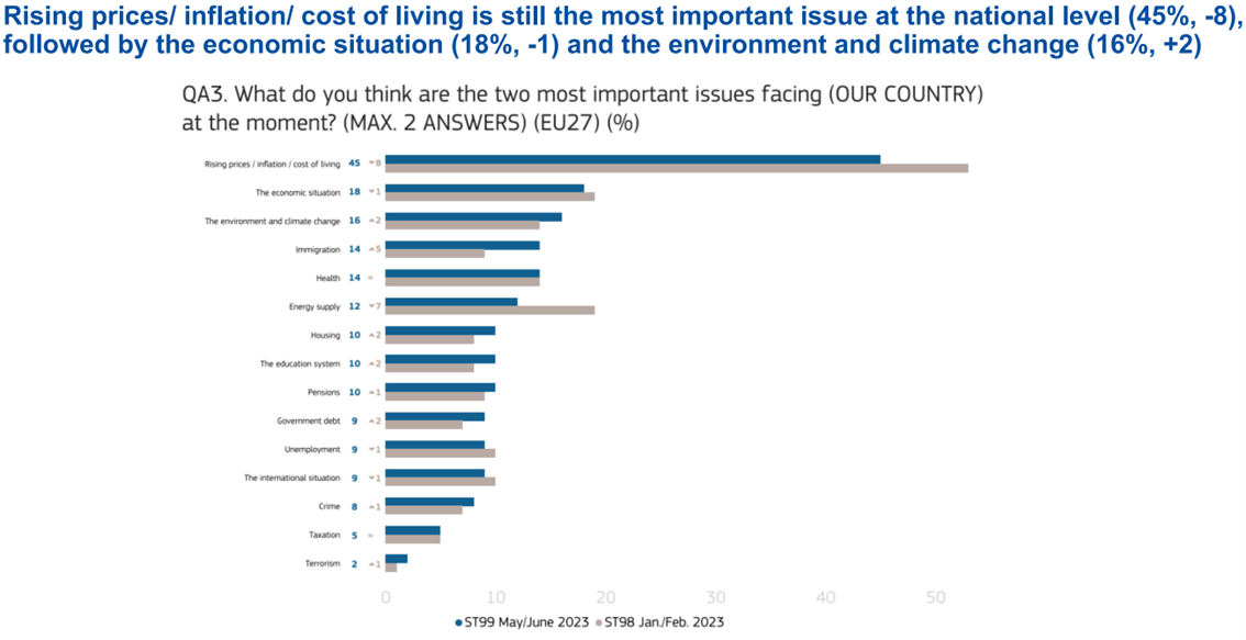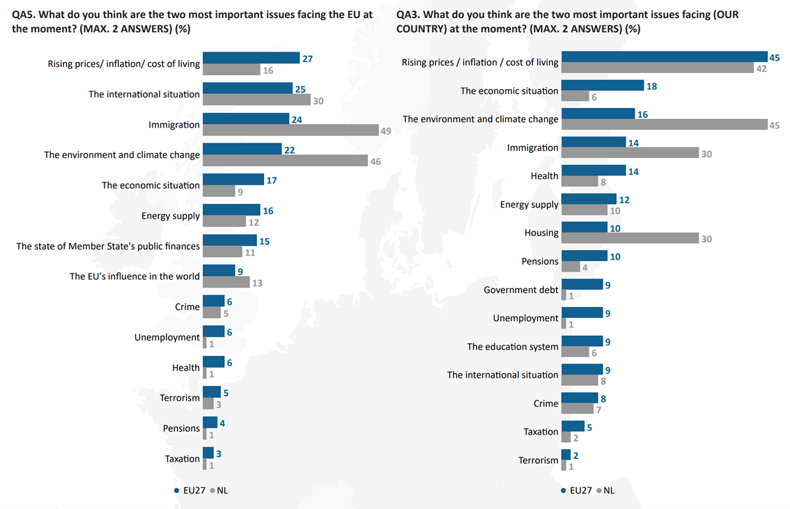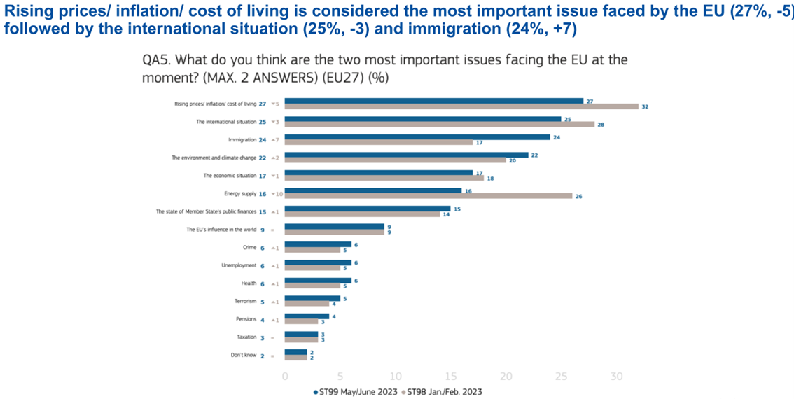 Aunque se ha atenuado con respecto a principios de año, el alza de precios sigue siendo la principal preocupación de los europeos: el 27% de los europeos piensa que el coste de vida es uno de los dos problemas más importantes a los que se enfrenta la UE en este momento; en segundo lugar se sitúa la situación internacional, por la guerra de Ucrania (25%); y la tercera es la inmigración (24%), tras crecer 7 puntos porcentuales, adelantando al cambio climático, que baja al cuarto puesto del ranking.