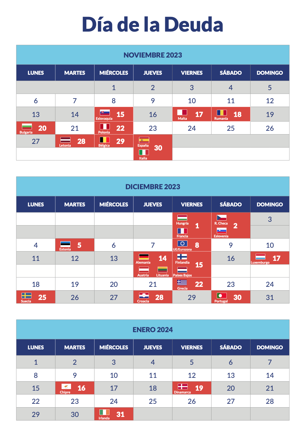 Según el análisis del IJM, si se comparan todos los ingresos y gastos previstos por las Administraciones para el año 2023, el saldo negativo alcanza el 8,6%. En términos de calendario, esto significa que, si distribuimos todos los ingresos del Estado a lo largo del ejercicio, estos caudales cubren apenas once meses de desembolsos. Por eso, el Día de la Deuda recae este año en el 30 de noviembre.