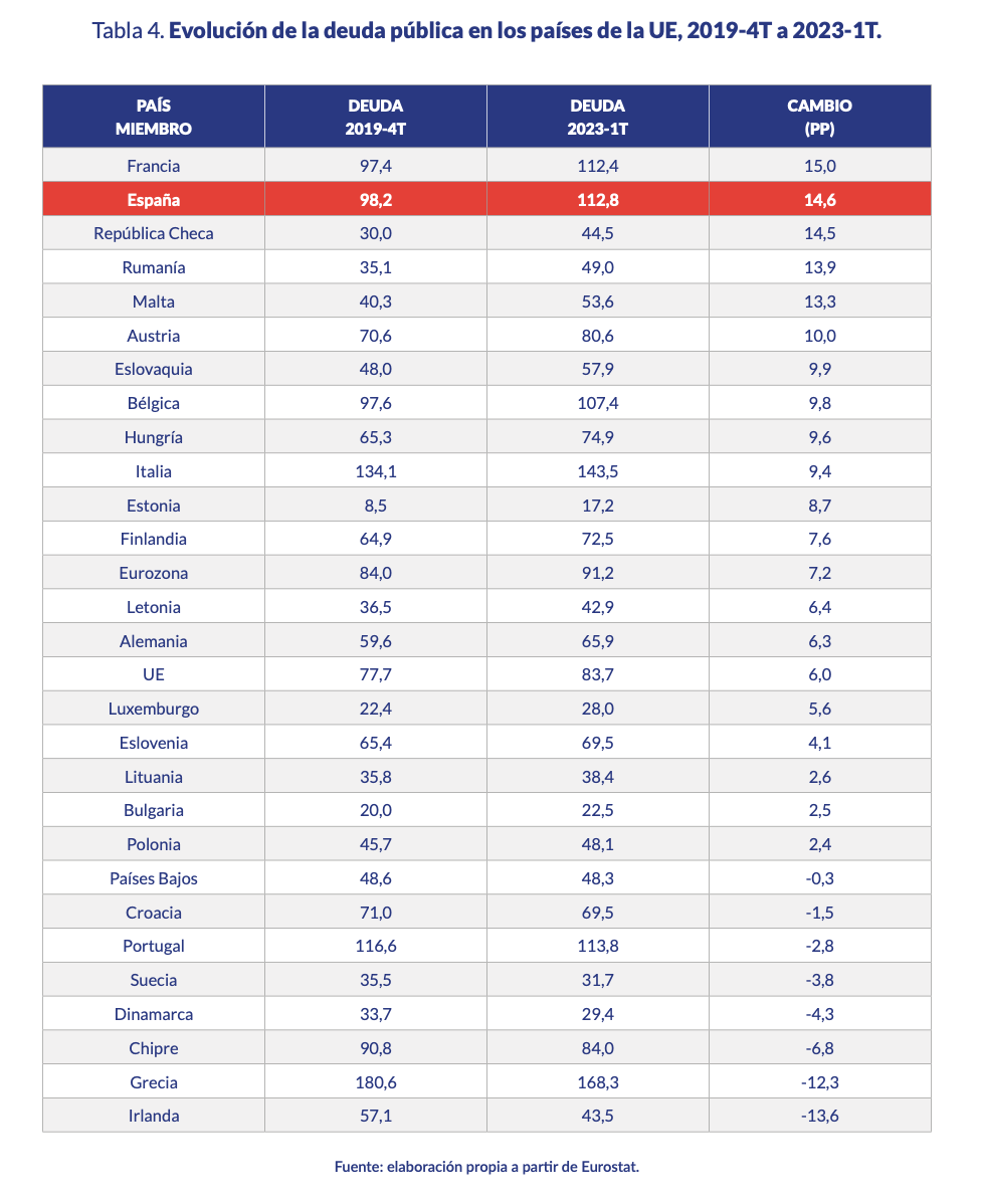 El documento también subraya que España se posiciona como el segundo país de Europa con el mayor aumento de la deuda pública desde finales de 2019 hasta el primer trimestre de 2023, registrando un incremento de 14,6 puntos del PIB, muy por encima del aumento observado en el conjunto de la Unión Europea, que fue de 6 puntos del PIB.