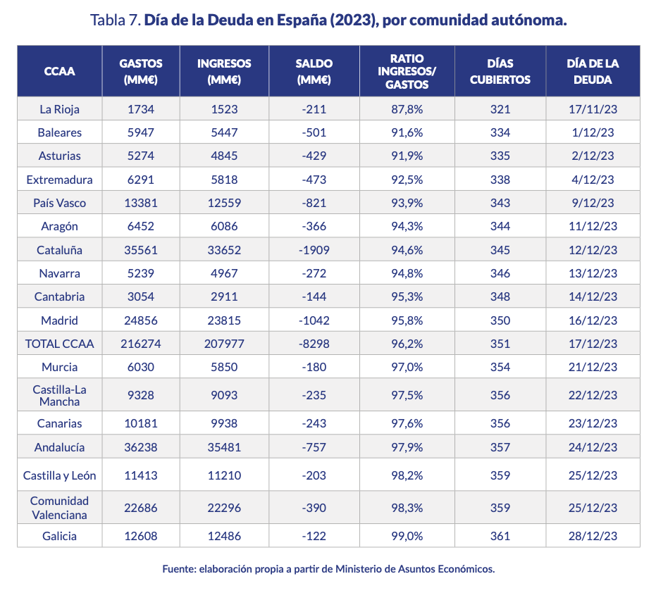 La situación varía según las Comunidades Autónomas. La Rioja encabeza la lista con el Día de la Deuda llegando el 17 de noviembre, mientras que Galicia destaca positivamente, agotando sus ingresos el 28 de diciembre. Sin embargo, la condonación de la deuda catalana que ha anunciado Pedro Sánchez puede desincentivar el rigor exhibido por regiones como Galicia y dar alas a las comunidades menos responsables desde el punto de vista fiscal.