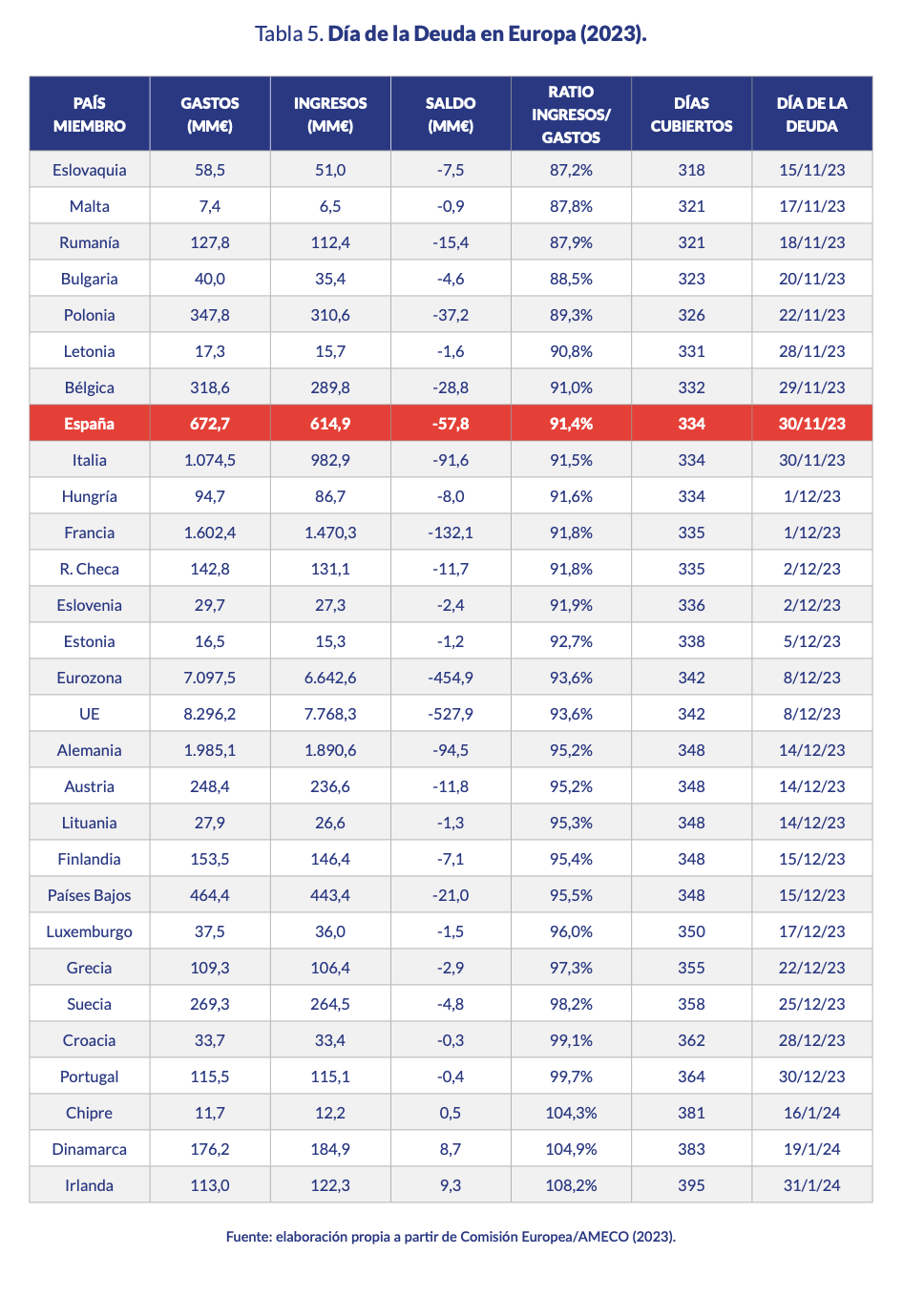 El informe del centro de estudios liberal observa que hay siete países de la UE en los que el Día de la Deuda de 2023 tiene lugar antes que en España, pero también recalca que la deuda media de estas economías es significativamente más baja, situándose en promedio en un 53,8% del PIB, de modo que la indisciplina fiscal que se haya podido apreciar en dichos países es menos preocupante que la española, ocurrida en un país como el nuestro, donde los pasivos públicos rondan el 110% del PIB.