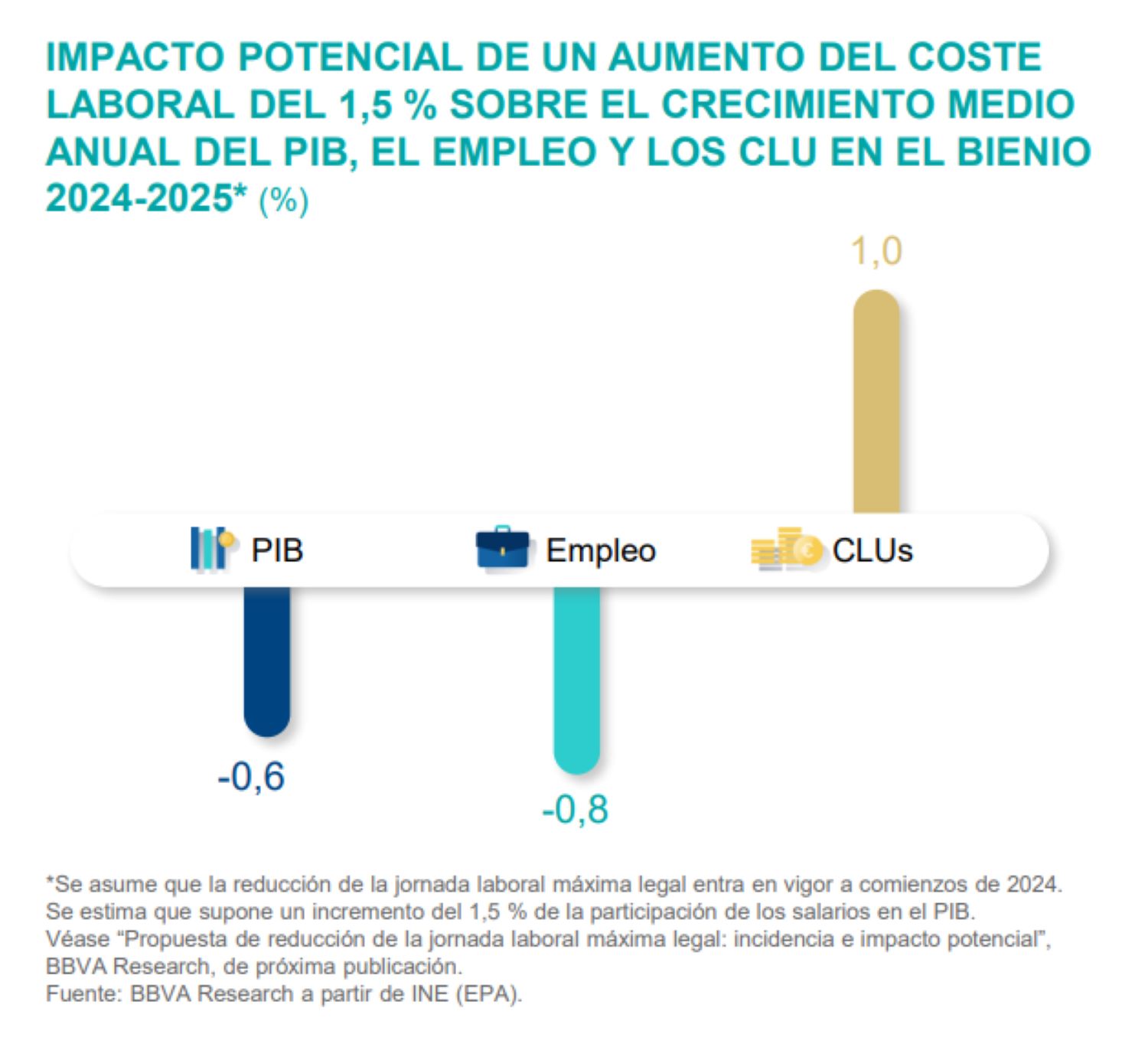 "Las medidas de política económica anunciadas pueden suponer un incremento de los costes laborales y fiscales", recoge el informe de BBVA Research. En concreto, el organismo destaca que "sin medidas compensatorias que alivien el aumento estimado de los costes laborales (1,5 % del PIB), el recorte del tiempo de trabajo restaría en torno a 6 décimas al crecimiento medio anual del PIB durante el próximo bienio y 8 décimas al del empleo".