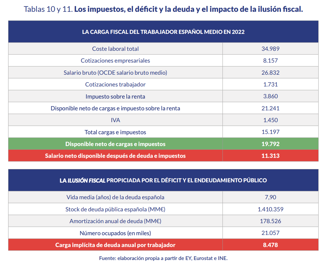 Este cálculo demuestra que vivimos muy por encima de nuestras posibilidades. En promedio, el salario neto disponible de un trabajador español se reduciría a apenas 11.313 euros después de pagar impuestos y devolver la deuda, lo que significa que, frente a un coste laboral total de casi 35.000 euros, el trabajador perdería euros 15.197 pagando el IRPF, el IVA y las cotizaciones sociales y, adicionalmente, dedicaría más 8.478 euros a abonar estos u otros gravámenes con ánimo de liquidar el déficit.