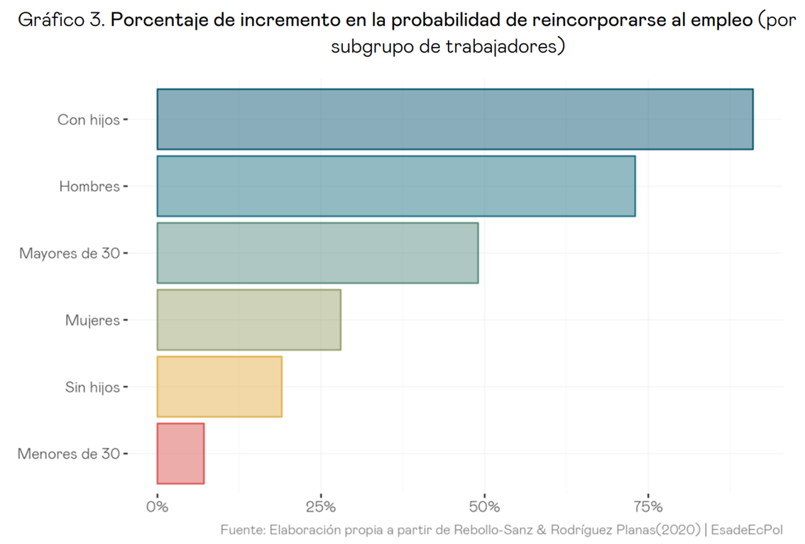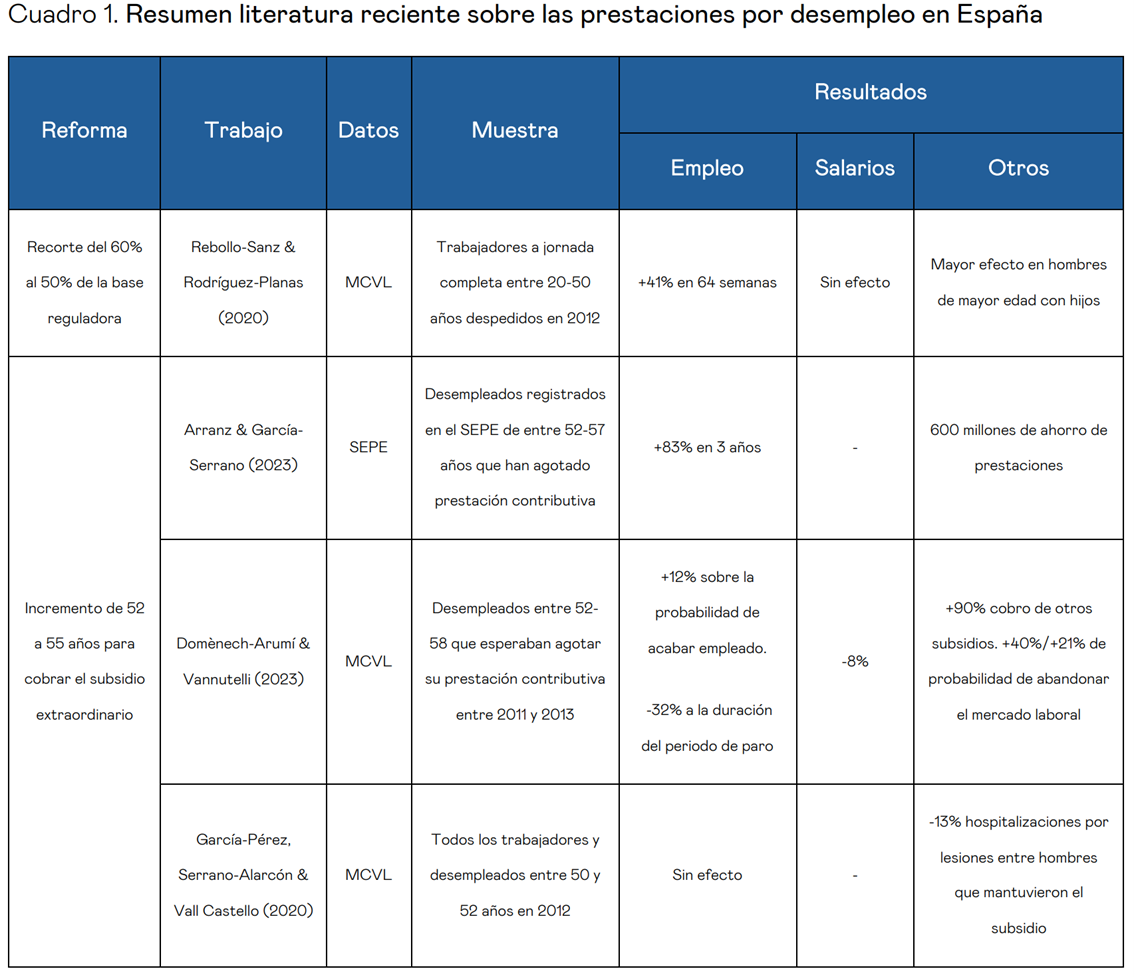 Asimismo, el incremento de la edad mínima, de 52 a 55 años, para percibir el subsidio extraordinario de desempleo también incrementó la probabilidad de volver a ocuparse, hasta un 12% durante el primer año y hasta un 83% a lo largo de los tres primeros años, si bien esta última modificación implicó algunos costes, como un incremento de la probabilidad de abandonar por completo del mercado laboral o una reducción salarial del entorno del 8%.