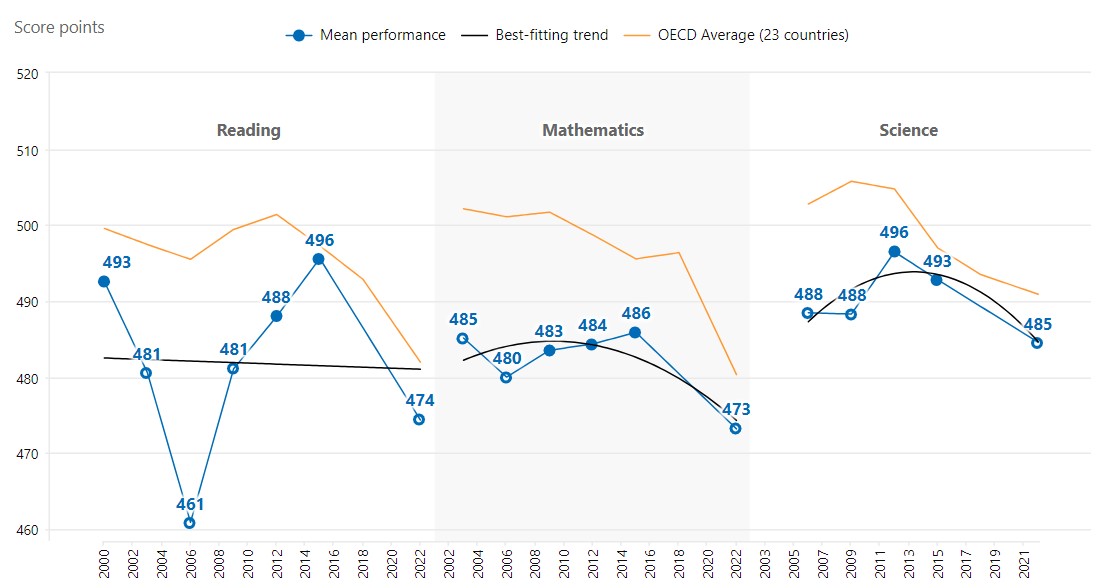 Pero no todo ha sido pandemia. Desde 2015, España ha caído 15 puntos en Matemáticas, 22 en Lectura y ocho en Ciencias. Si nos comparamos con 2012, el descenso ha sido de 11 puntos en Matemáticas, 14 en Lectura y 11 en Ciencias. En el gráfico que podemos ver a continuación se muestran las notas de España (en azul, con la puntuación en cada prueba) y la media de la OCDE (en naranja): como vemos, la tendencia es descendente desde mucho antes del Covid. Es verdad que España tuvo una nota pésima en Lectura en 2006 que distorsiona mucho la figura. Pero si eliminamos esa calificación, lo que tenemos es que tanto nuestro país como el conjunto de los que hacen PISA muestran una clara tendencia negativa desde hace mucho, especialmente en Matemáticas y Ciencia.