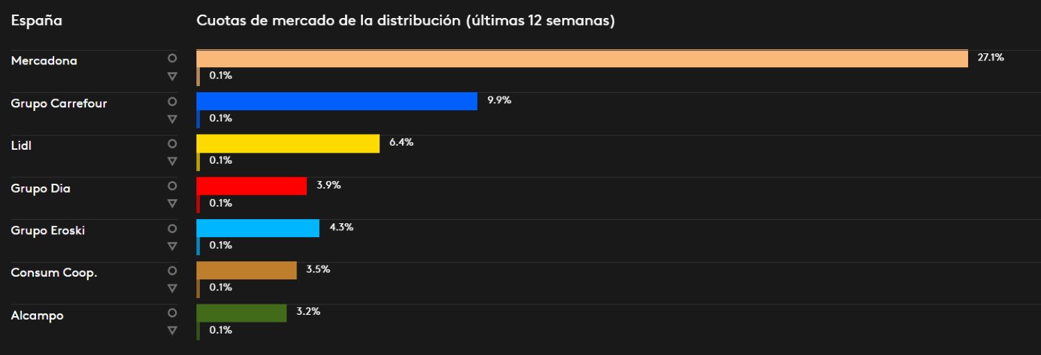 Mercadona es un modelo de éxito, pues es la empresa líder de su sector. De acuerdo con los datos proporcionados por Kantar, la cadena de supermercados de Juan Roig se consolida como la más importante, con una cuota de mercado que ya supera el 27%. Así, hace un año ésta era del 25,5%, por lo que ha experimentado un crecimiento del 6,3% (1,6 puntos porcentuales) desde entonces.