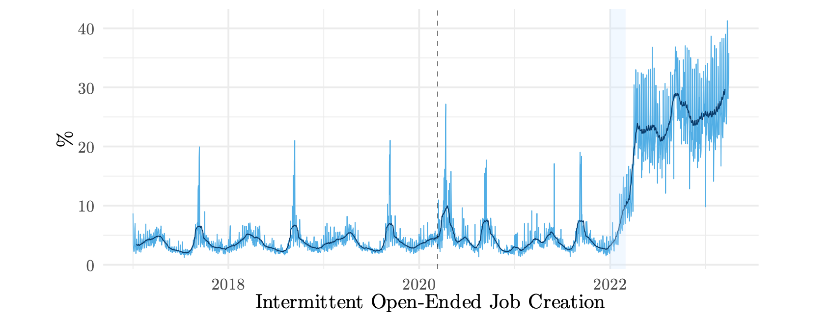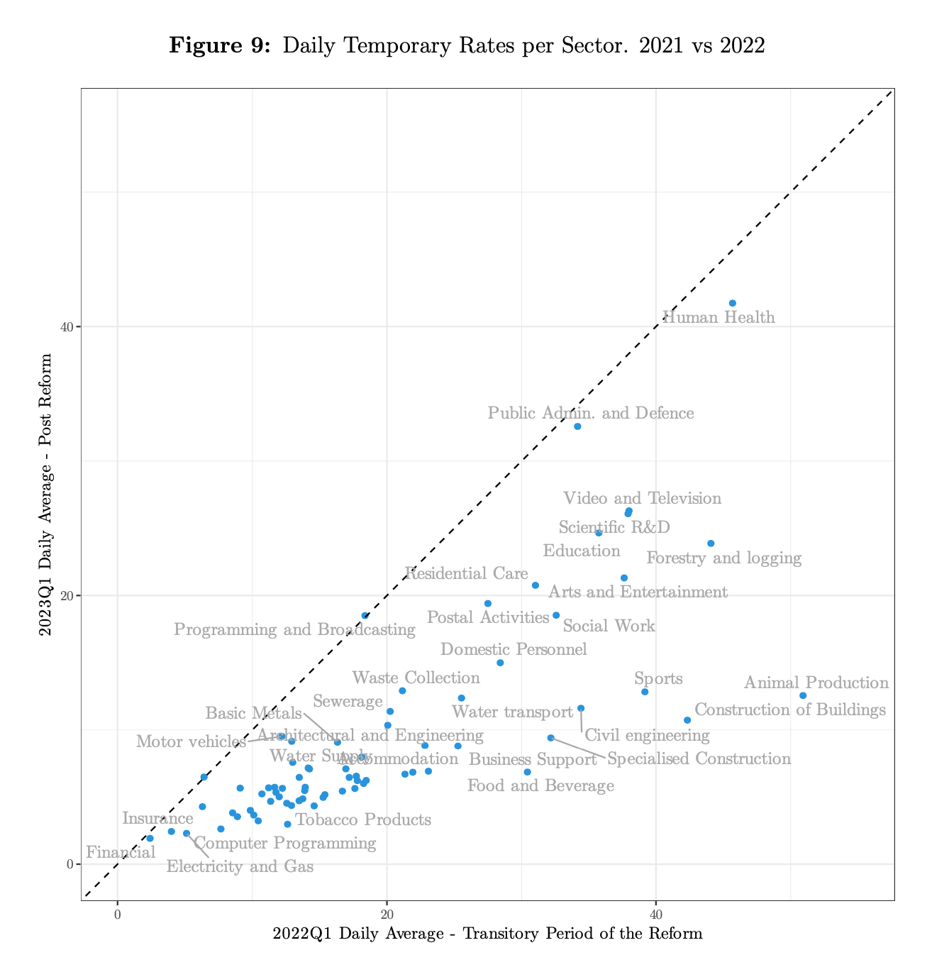 El documento prosigue recalcando que "no hay reducción empírica de la temporalidad" y que, en la práctica, el empleo temporal sigue el mismo patrón que antaño. "Utilizando un modelo de series temporales en el que se comparan los patrones de creación y destrucción de empleo antes y después de la reforma, no se encuentran diferencias estadísticamente grandes", señalan los autores del trabajo.