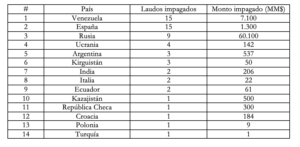 Si repasamos el índice, encontramos que solamente hay otros 11 países con laudos pendientes de pago. Se trata de Ucrania (4 laudos por valor de 142 millones de dólares), Argentina (3 laudos por valor de 537 millones), Kirguistán (3 laudos por valor de 50 millones), India (2 laudos por valor de 206 millones), Italia (2 laudos por valor de 22 millones), Ecuador (2 laudos por valor de 61 millones), Kazajistán (1 laudo por valor de 500 millones), República Checa (1 laudo por valor de 300 millones), Croacia (1 laudo por valor de 184 millones), Polonia (1 laudo por valor de 9 millones) y Turquía (1 laudo por valor de 1 millón).
