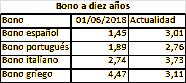 El uno de junio de 2018, la rentabilidad del bono español a diez años era del 1,45%; la del portugués, el 1,89%; la del italiano, el 2,74%; y la del griego, el 4,47%. Es decir, frente a todos ellos, el bono español tenía que pagar una menor rentabilidad por un producto similar.