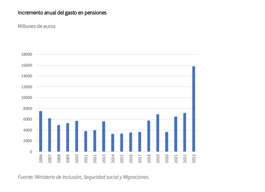 En el caso del gasto en pensiones hay que tener en cuenta que este epígrafe viene creciendo sistemáticamente cada año debido a cada vez hay más jubilados por el aumento de la esperanza de vida y a que los que entran en el sistema cada vez cobran más. Sin embargo, el ritmo de subida de 2023 ha sido insólito. Tanto es así, que Funcas ha elegido a esta cifra como "el dato del año porque se trata del mayor incremento anual de la historia, que triplica el ritmo de crecimiento registrado a lo largo de los últimos 15 años". Según señala Funcas, el gasto en pensiones, contributivas y no contributivas se elevó 15.800 millones más en 2023.