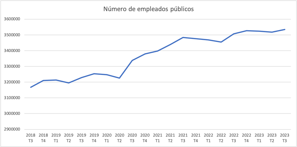 En el siguiente gráfico se puede comprobar cómo ha subido el número de empleados públicos bajo gobierno de Pedro Sánchez. Si al comienzo de su mandato (2018 T3) había 3.167.500 personas en nómina de la Administración, esta cifra asciende ahora (2023 T3) a 3.534.700 asalariados, lo que supone un incremento de 367.200 trabajadores bajo mandato del presidente socialista.