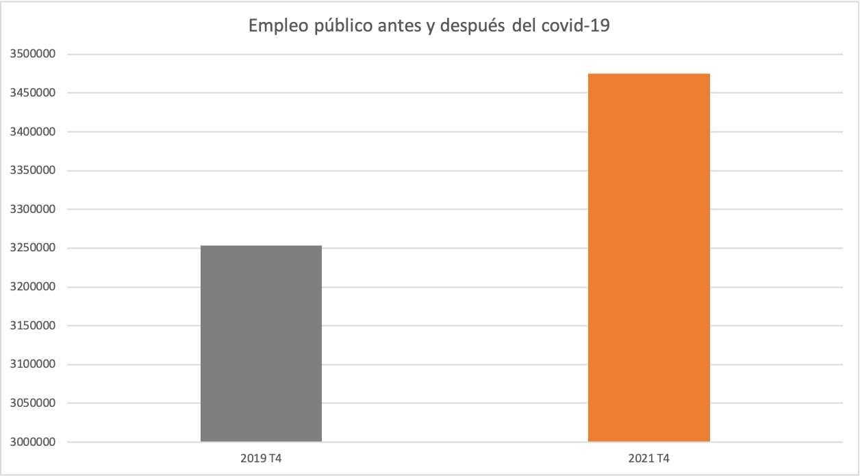 Si comparamos los datos previos a la pandemia (2019 T4) con los números posteriores a la emergencia del covid-19 (2021 T4), encontramos que la subida producida entonces fue de 222.200 efectivos, al pasar de 3.253.300 a 3.475.500 personas en plantilla.