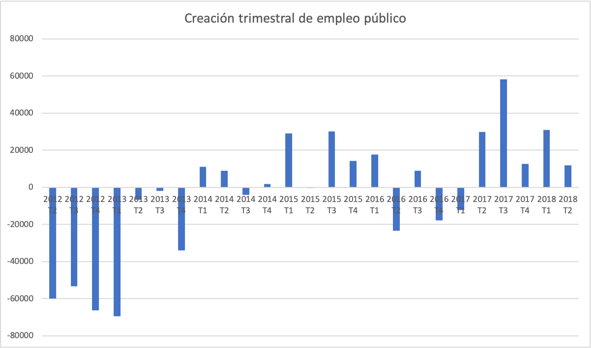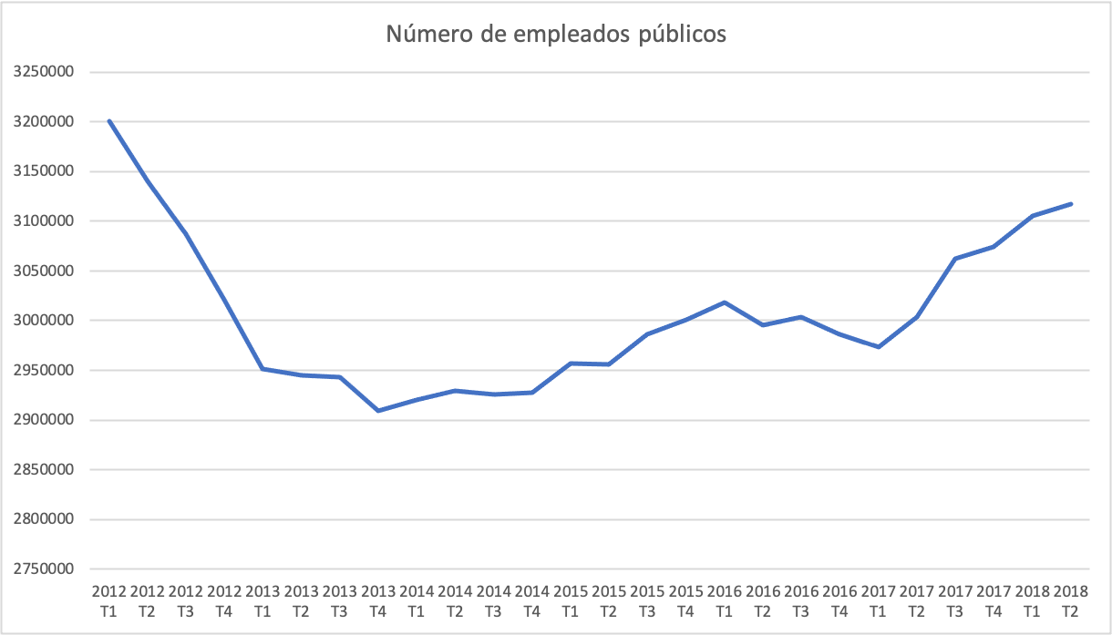 Si comparamos estos datos con los del periodo político anterior (gobierno de Mariano Rajoy), encontramos que el tamaño de la plantilla del sector público no solamente no aumentó, sino que se redujo de 3.200.500 a 3.117.800 personas, lo que supone una reducción de 82.700 efectivos o, lo que es lo mismo, una caída media de 3.308 ocupados por trimestre.