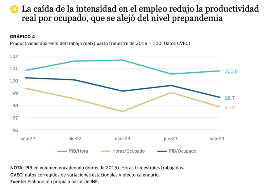 De hecho, si establecemos otros indicadores de control, podemos ver que la productividad está por debajo de los niveles alcanzados antes de la pandemia, en 2019. Por ejemplo, si relacionamos las horas con el número de ocupados, el descenso es del 2,1%, mientras que comprando el PIB generado con el número de ocupados apreciamos una caída que ya alcanza el 1,3%.