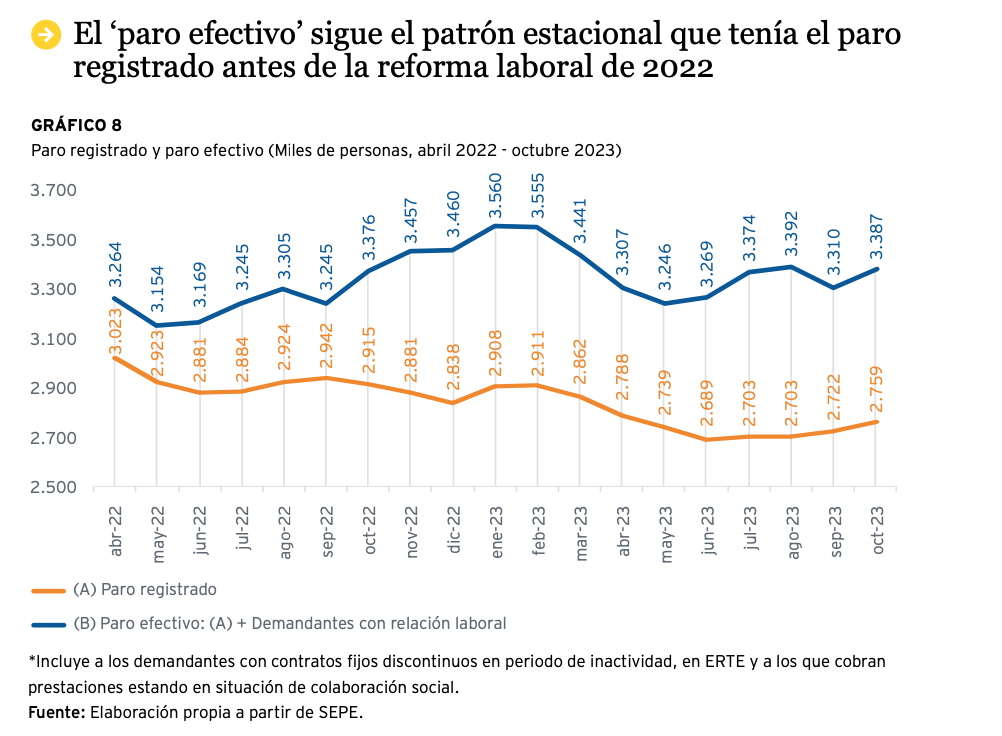 El paro registrado sigue una senda bajista, pero está distorsionado por el maquillaje estadístico que introdujo la contrarreforma laboral de Yolanda Díaz. Si consideramos la situación de los fijos discontinuos en periodo de inactividad, los afectados por ERTE o las personas que cobran prestación estando en situación de colaboración social, encontramos que hay 3.387.000 parados efectivos, frente a los 2.759.000 desempleados oficiales. La brecha entre los datos del gobierno y la realidad del mercado de trabajo ya asciende a 628.000 personas. Lo vemos en el siguiente gráfico: