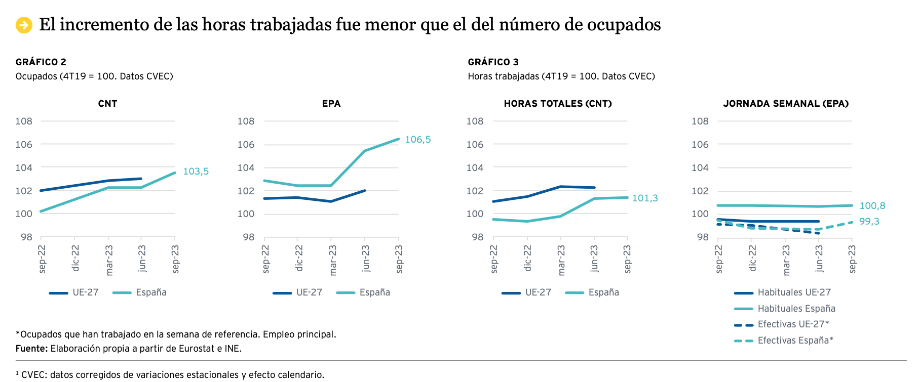 Por otro lado, incluso si tomamos como referencia los datos oficiales, encontramos que el incremento de las horas trabajadas fue menor que el del número de ocupados. De hecho, el aumento de las horas totales trabajadas es casi inexistente, con una subida casi inexistente del 0,1%. Así queda reflejado en el siguiente gráfico: