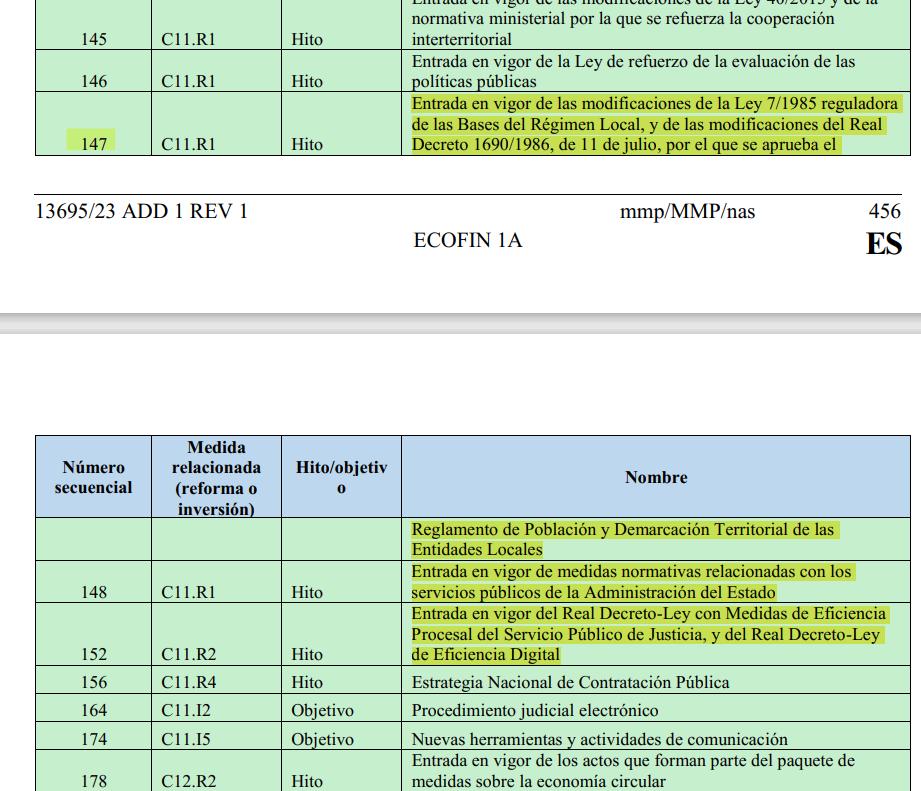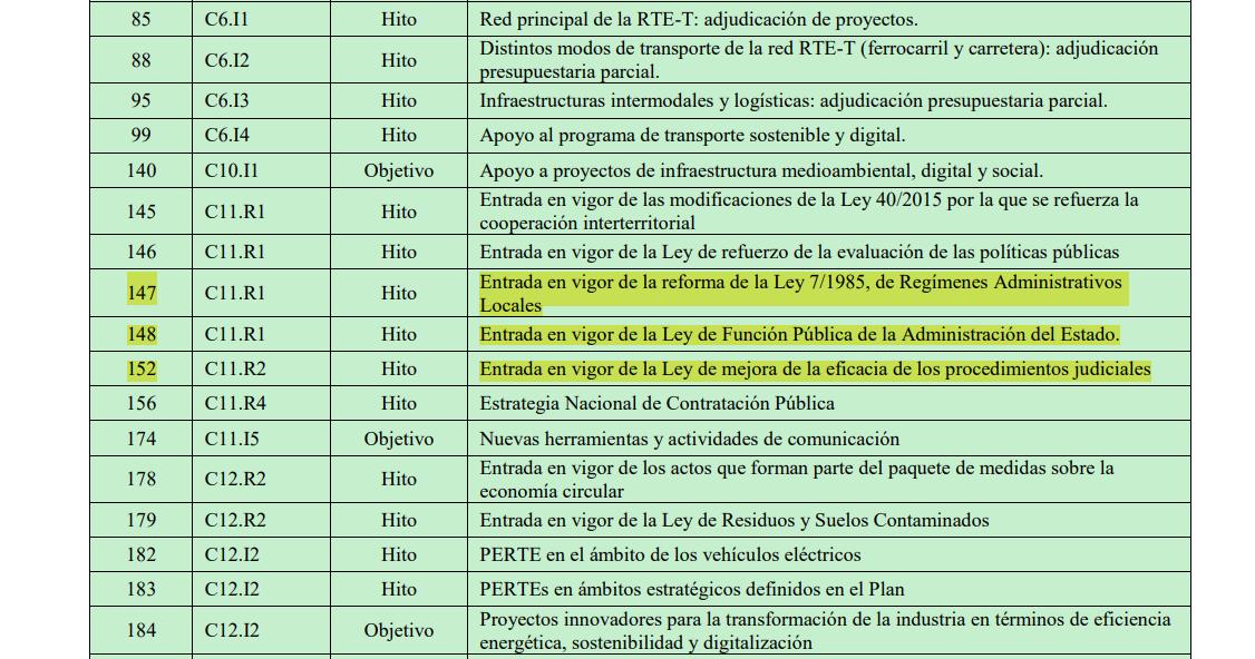 El resultado, la sustitución de estas leyes por nuevos hitos de menor calado administrativo, evidenciando una reducción en la ambición inicial. La Ley de función Pública se sustituyó por la "entrada en vigor de medidas normativas relacionadas con los servicios públicos de la Administración del Estado" y la Ley de mejora de la eficacia de los procedimientos judiciales por la "entrada en vigor del Real Decreto-Ley con Medidas de Eficiencia Procesal del Servicio Público de Justicia, y del Real Decreto-Ley de Eficiencia Digital".