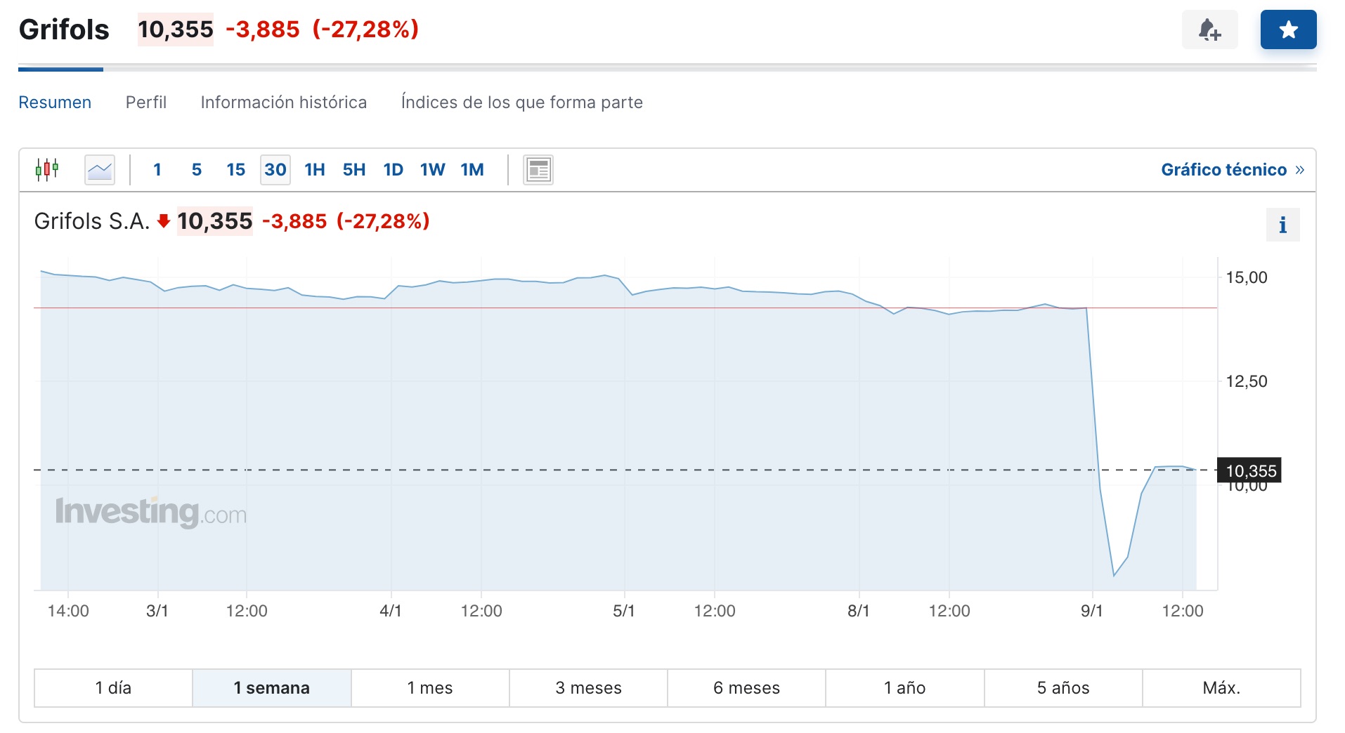 La reacción en los mercados no se ha hecho esperar. Desde primera hora, Grifols acumula caídas del entorno del 30%, desplomándose desde el entorno de los 15 euros por acción al entorno de los 10 euros. Grifols, en plena pandemia se disparó por encima del 30%.