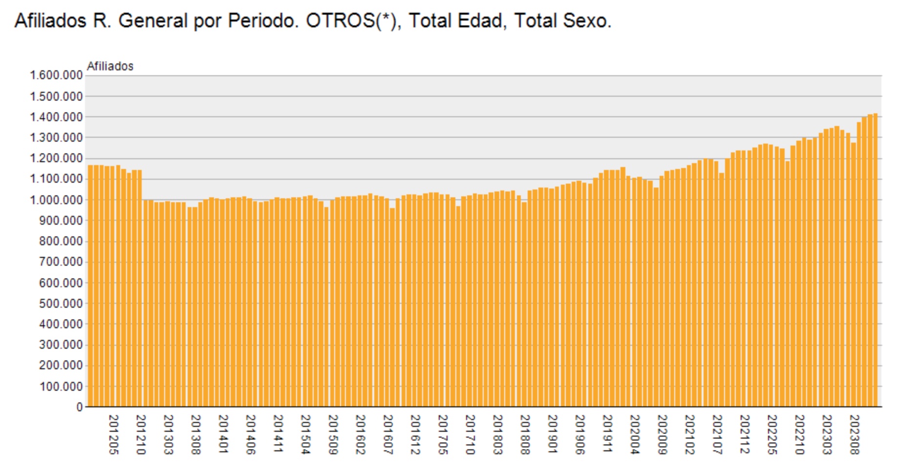 Actualmente, los estudiantes que realizan prácticas remuneradas se engloban en la categoría de afiliados denominados "Otros", que supera los 1,4 millones de cotizantes e incluye a afiliados sin contrato como funcionarios (el 80%), becarios que cobran (el 6%) o cuidadores no profesionales. Tal y como se observa en el siguiente gráfico, este tipo de afiliados lleva creciendo considerablemente desde 2019.