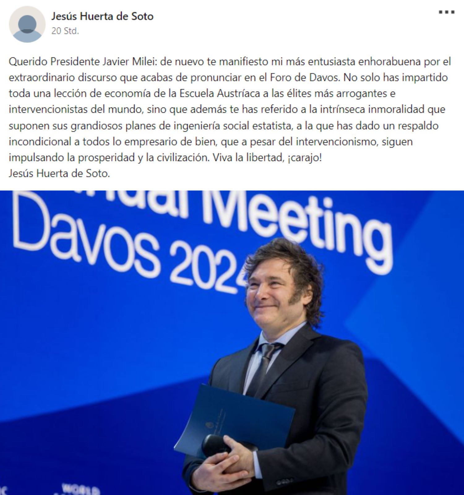 "No solo has impartido toda una lección de economía de la Escuela Austríaca a las élites más arrogantes e intervencionistas del mundo, sino que además te has referido a la intrínseca inmoralidad que suponen sus grandiosos planes de ingeniería social estatista, a la que has dado un respaldo incondicional a todos lo empresario de bien, que a pesar del intervencionismo, siguen impulsando la prosperidad y la civilización", publicó el catedrático de la Universidad Rey Juan Carlos, que como es ya habitual en todas sus comunicaciones con el presidente argentino, ha cerrado con un "Viva la libertad, ¡carajo!".