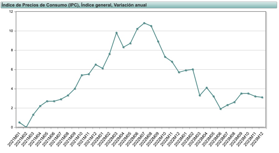 Si prestamos atención a la gráfica del INE, observamos cómo la inflación en España ha pasado entre 2021 y 2022 del 0% a picos del 11% en verano de 2022, para ir moderándose la curva al entorno del 3% en el que nos encontramos a finales de 2023.