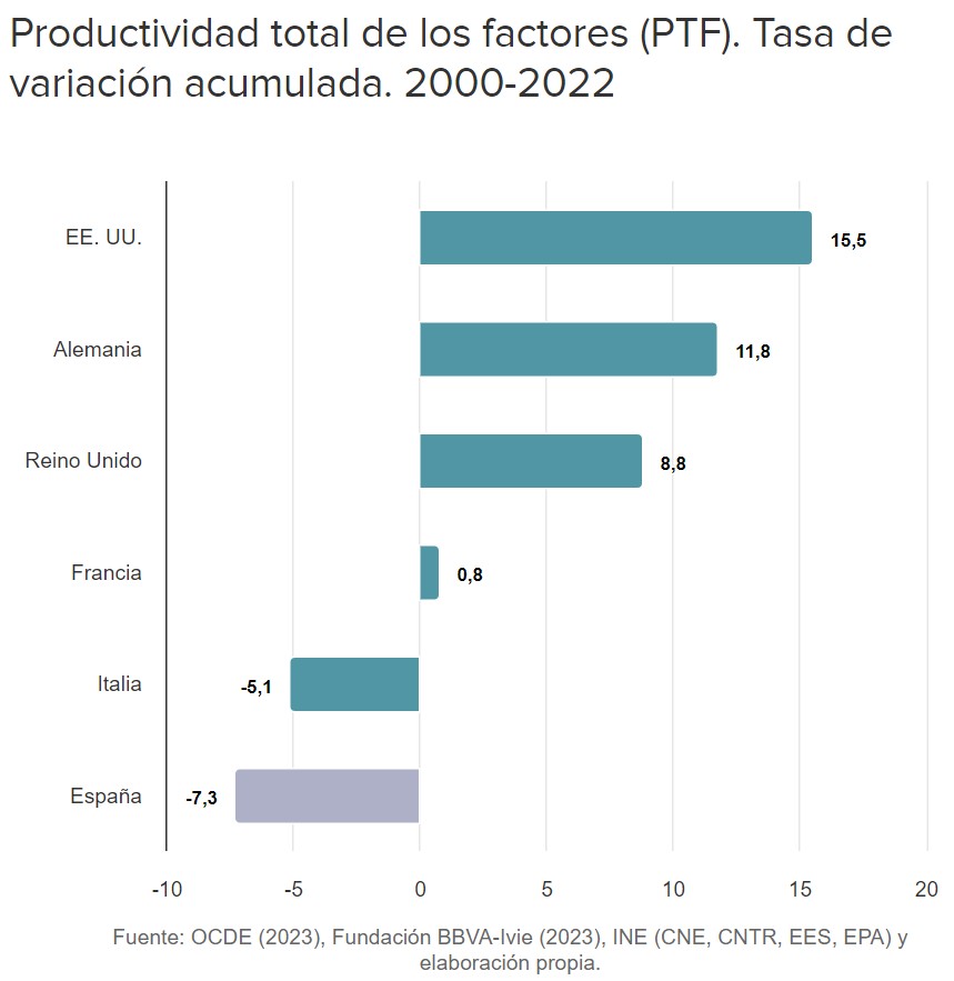 - "El empleo de más cantidades de trabajo y capital ha contribuido a que el PIB de España crezca, pero las mejoras en el aprovechamiento productivo de esos factores podrían también contribuir al crecimiento del PIB y eso no ha ocurrido". O, lo que es lo mismo, sí tenemos más capital y más personas trabajando que en el 2000, pero les sacamos menos rendimiento del que deberíamos.