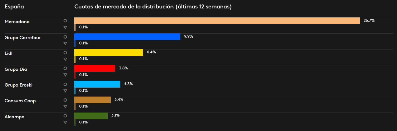 Sólo Mercadona supera a Carrefour en nuestro país, con una cuota de mercado del 26,7%. En cambio, Lidl queda por detrás de la cadena francesa ocupando el 6,4% del mercado. Por su parte, Eroski cuenta con una cuota del 4,3% en el mercado de la distribución en España, mientras que Dia supone en 3,8% del total. Finalmente, encontramos a Consum con el 3,4% y Alcampo con el 3,1%.