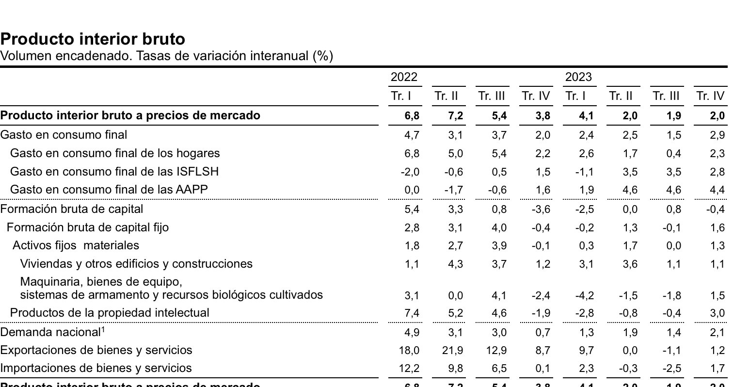 El más reciente es el de la evolución del PIB a cierre de 2023. El INE ha adelantado que la economía española creció el año pasado un 2,5%, una cifra que supera a las predicciones de la gran mayoría de los analistas y que se sitúa una décima por encima de los propios pronósticos del Gobierno, que suelen ser siempre los más optimistas. La sorpresa ha venido en el cuarto trimestre, después de que el PIB diera un acelerón del 0,6%, el mayor de todos los trimestres del pasado año.