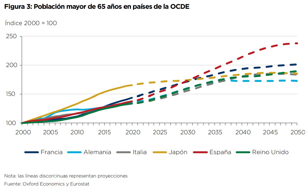Este gráfico es diferente a otros que hemos visto sobre el mismo tema. En el eje vertical no está la edad media, ni el porcentaje de población de más de 65 años. En realidad, lo que muestran las líneas es la tendencia. Tenemos seis economías ricas y envejecidas en el año 2000 partiendo del mismo punto (100); lo que nos indica el gráfico es cómo han evolucionado hasta 2020 y las previsiones hasta mediados de siglo. La línea roja es España.