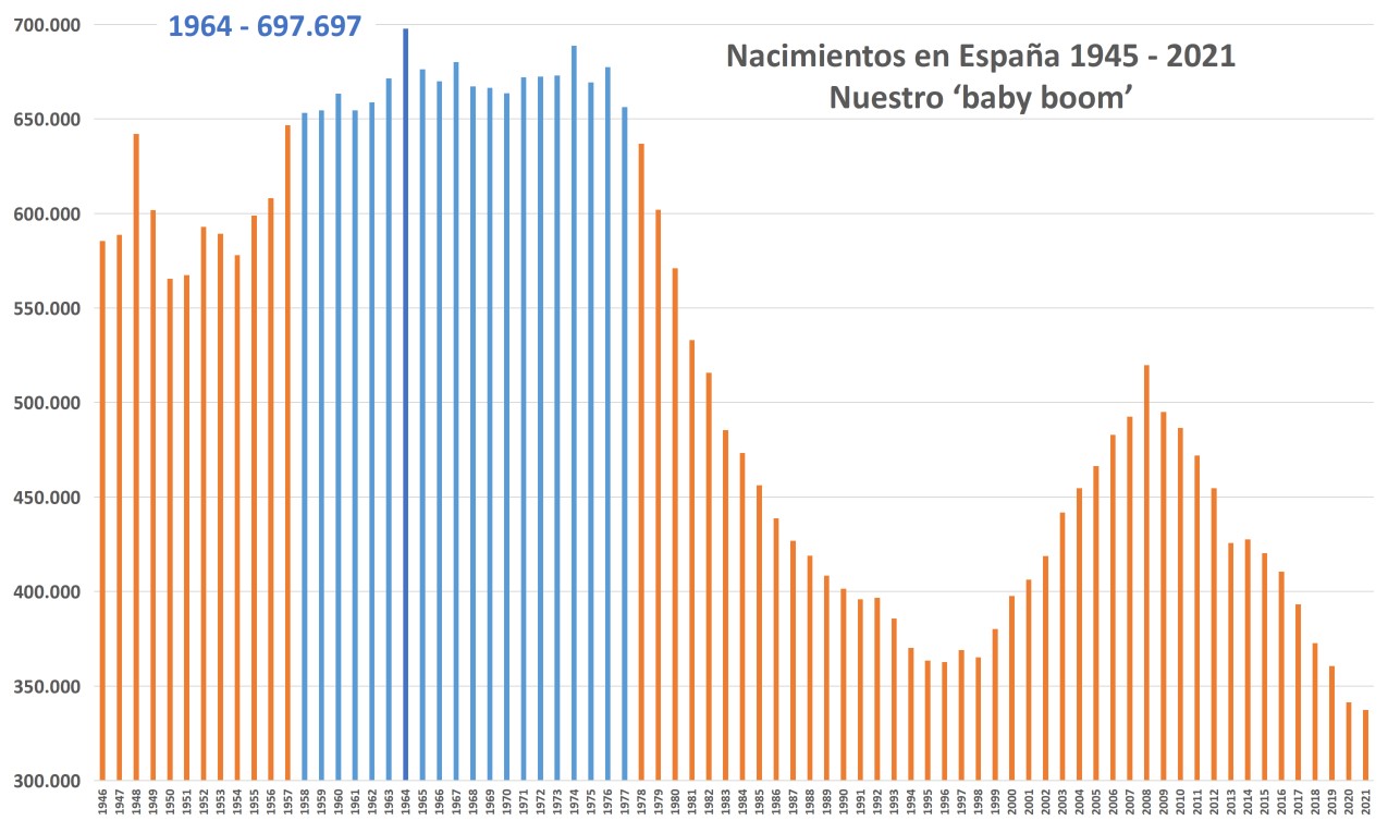 En azul, los años del baby-boom en España. Hemos denominado así a las dos décadas en las que el número de nacimientos superó los 650.000 cada año (ahora mismo estamos en menos de 340.000, pero eso lo dejaremos para otro día). Como vemos, comienzan en 1958 (una década después que en el resto de Europa) y se alarga hasta finales de los 70. El pico se alcanza en 1964, con casi 700.000 nacimientos.