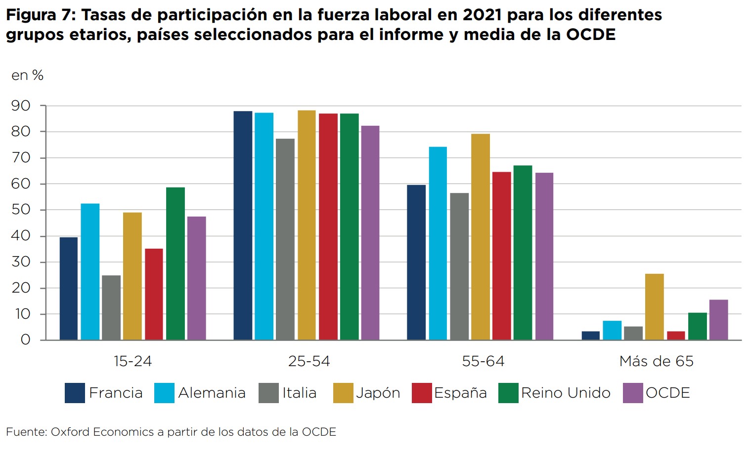 El problema con la situación actual es que incluso ese nivel de los 67, mucho más elevado, si se alcanza en términos reales, que los 61-62 de comienzos de siglo, parece insuficiente. Hace unos días se publicaba un informe muy interesante al respecto: El impacto de la edad en el mercado de trabajo y en la resiliencia de las empresas en España, de Oxford Economics y la Universidad de Salamanca para el Centro Internacional sobre el Envejecimiento (Cenie).