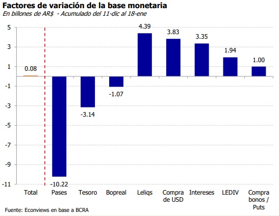 Sin embargo, el camino a la dolarización no será inmediato, de modo que el político libertario se ha visto obligado a replantear la política monetaria del Banco Central y apostar por una notable contracción de la base monetaria, que apenas ha aumentado un 0,08% desde el 11 de diciembre hasta el 18 de enero.